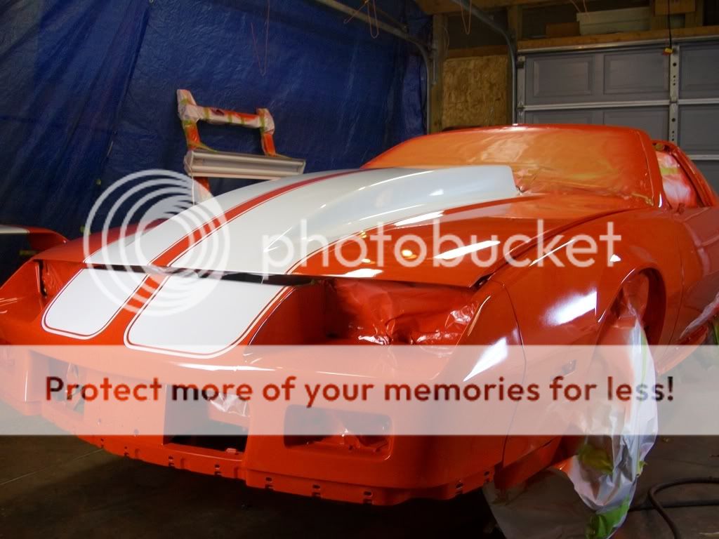 the car is completly jamed, we painted the inside lip of the fenders orange and the engine bay is flat black. I layed out the stripes, and i couldn't get them very sharp. im proud of them for a kid who has never layed something out of a car before. we painted the car in our garage with tarps sectioning the area off. ha