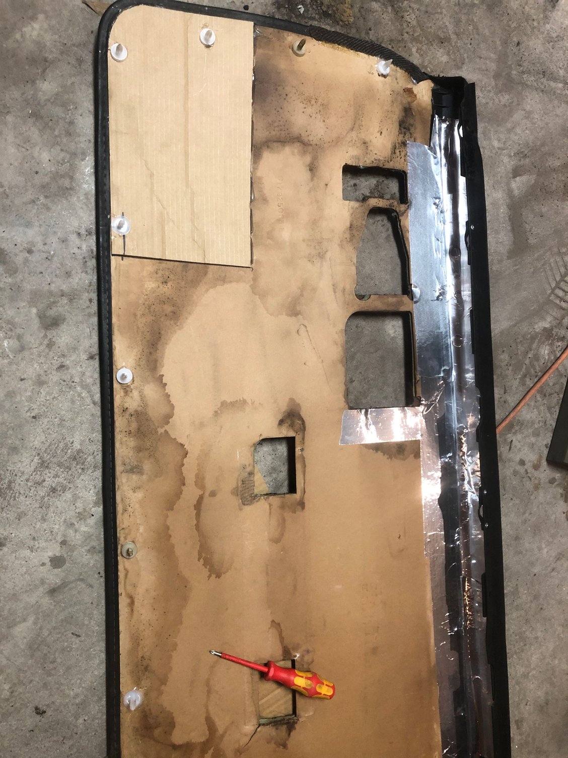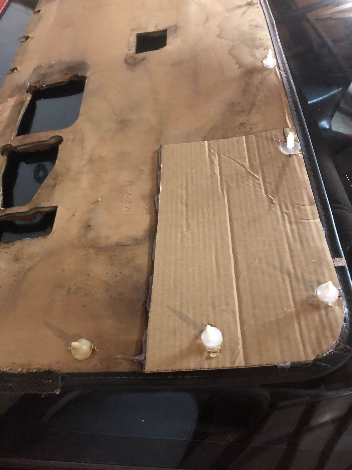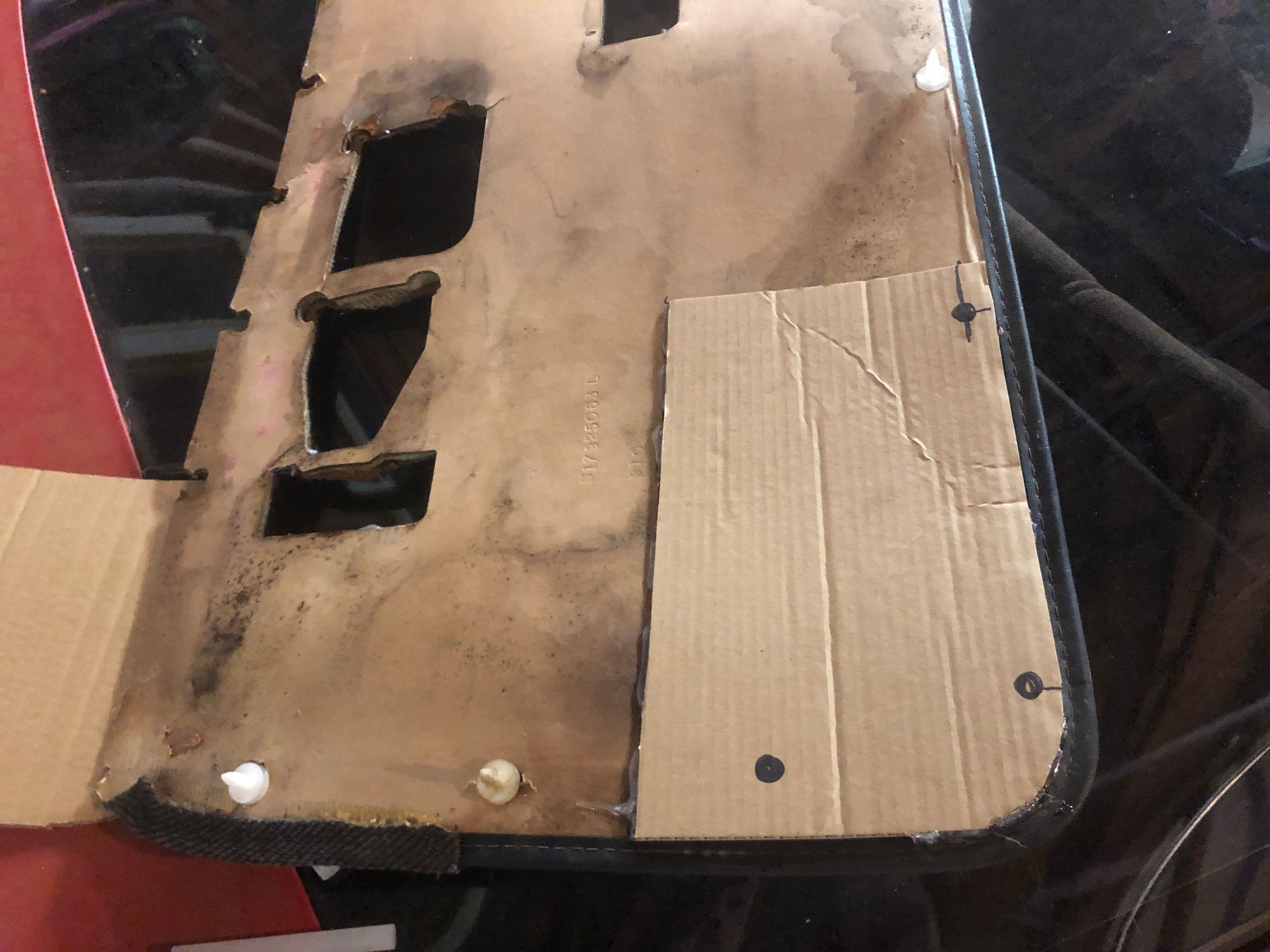 So...neither of the power windows work and I determined it was the motors , that being said I took the door panel off and of course it was all water damaged and rotted in the front bottom corner . I made a patch outta son Xmas boxes and got some new push pins and she’s good to go