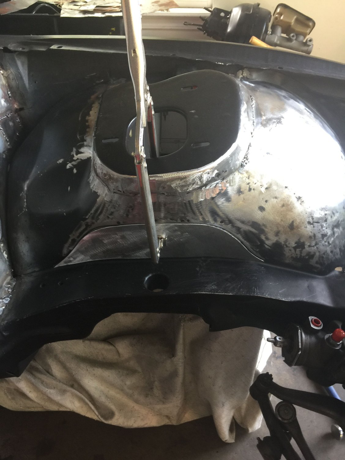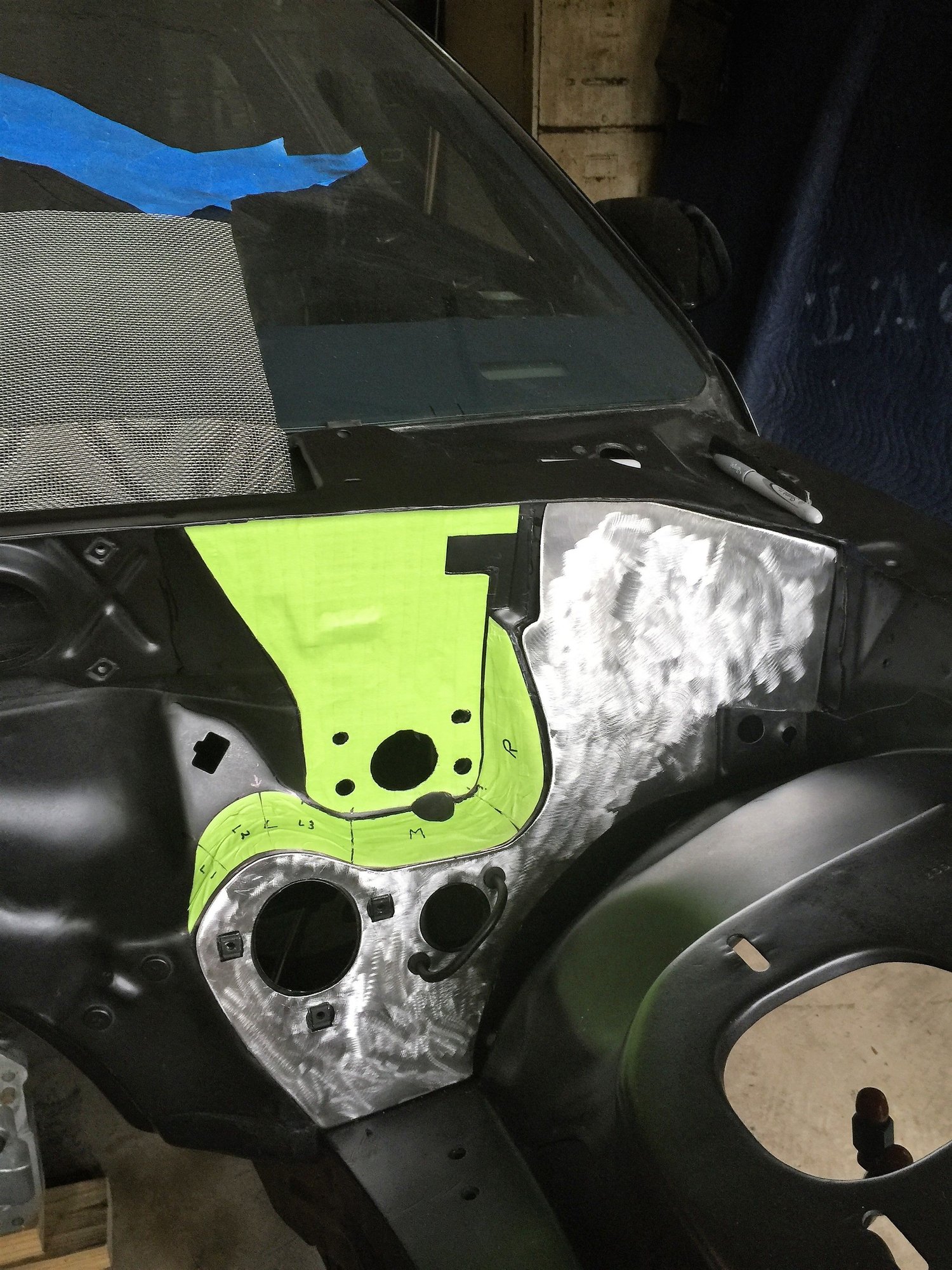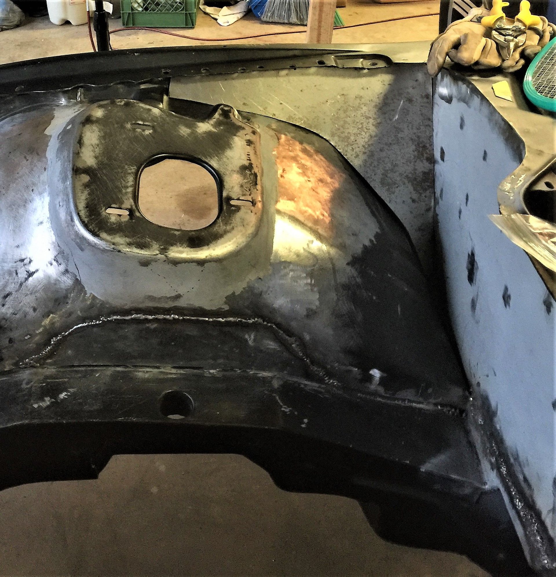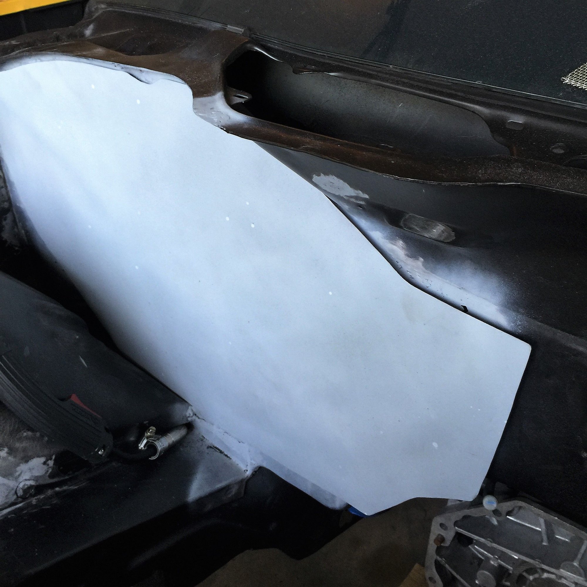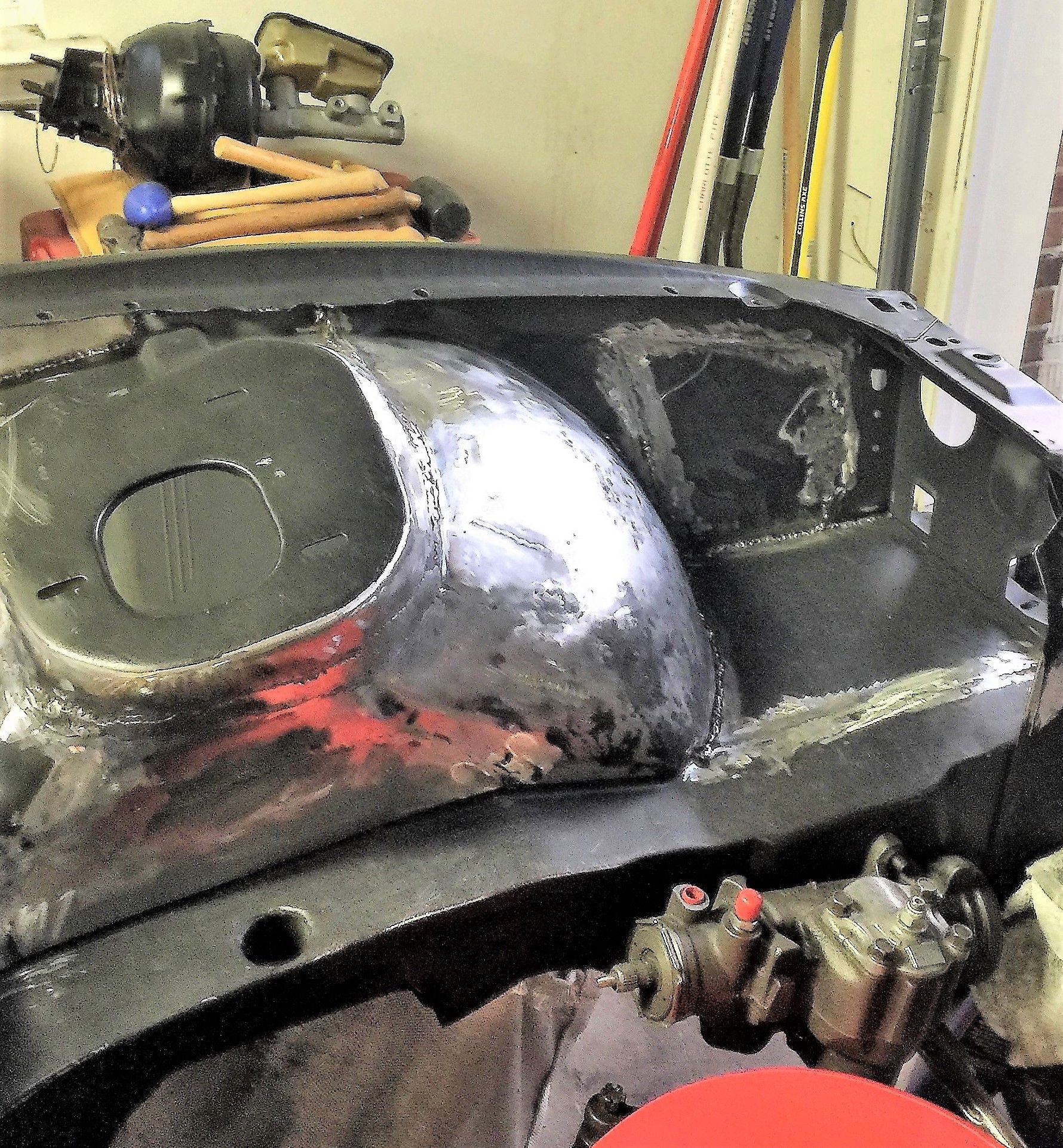 Changes of this magnitude take time Another reinforcement plate for a total of 3 at the firewall, plus, inner fender close out panel more welding headlight area smoothed Test fit of passenger side closeout panel. It was refined a bit before welding starting to look better battery tray delete