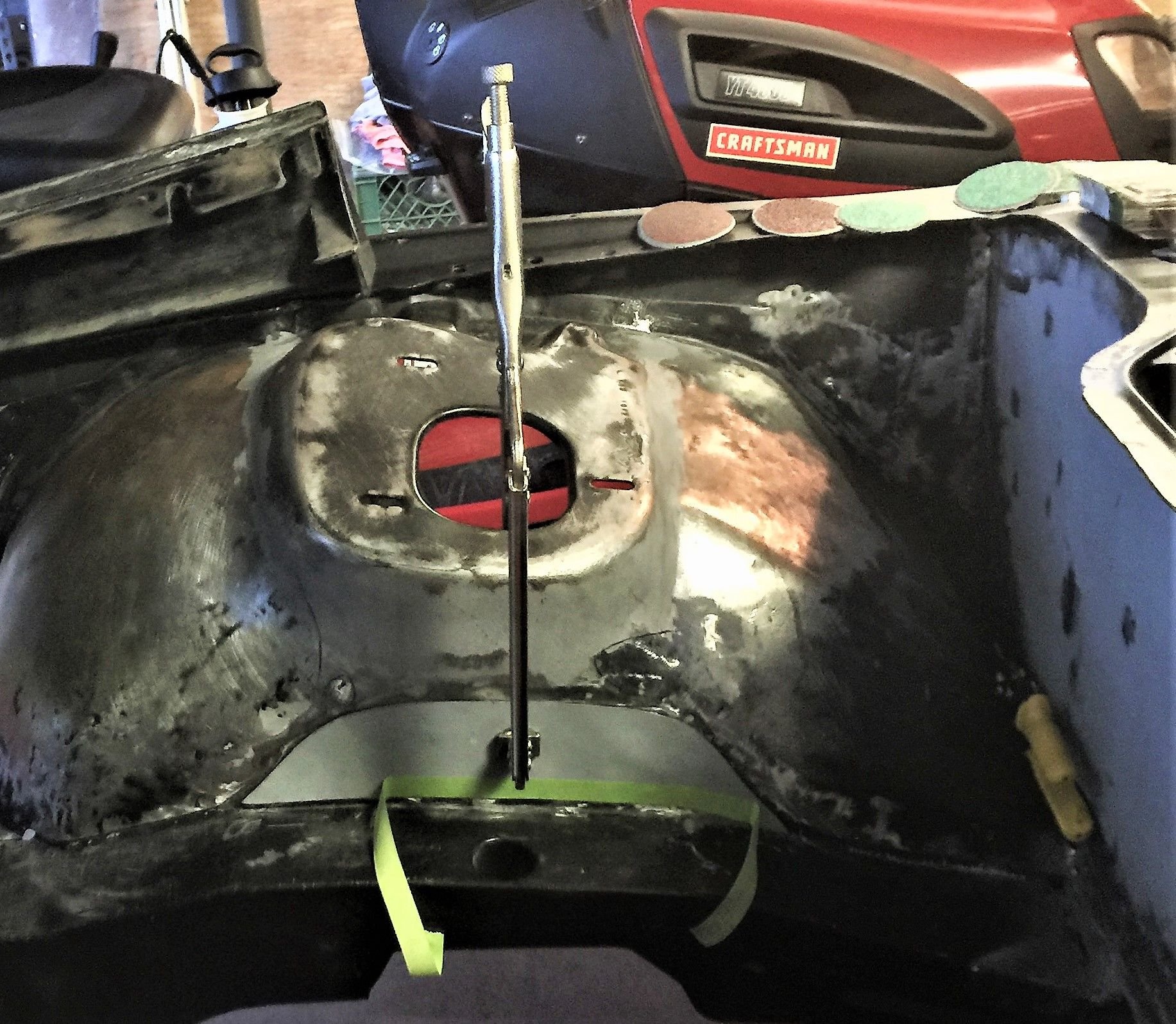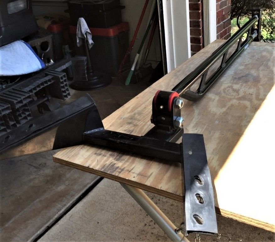 Cross-member with weight-jack plates & jacks screws during modification phase. Beaucoup holes were filled, seams welded, everything smoothed, motor mount nuts welded in place and the locating pins reinforced. One fell off when I removed the cross-member, the other I removed by hand. Cross-member powder coated, frame rails drilled & reinforced for weight jack bolts and engine bay in black primer.