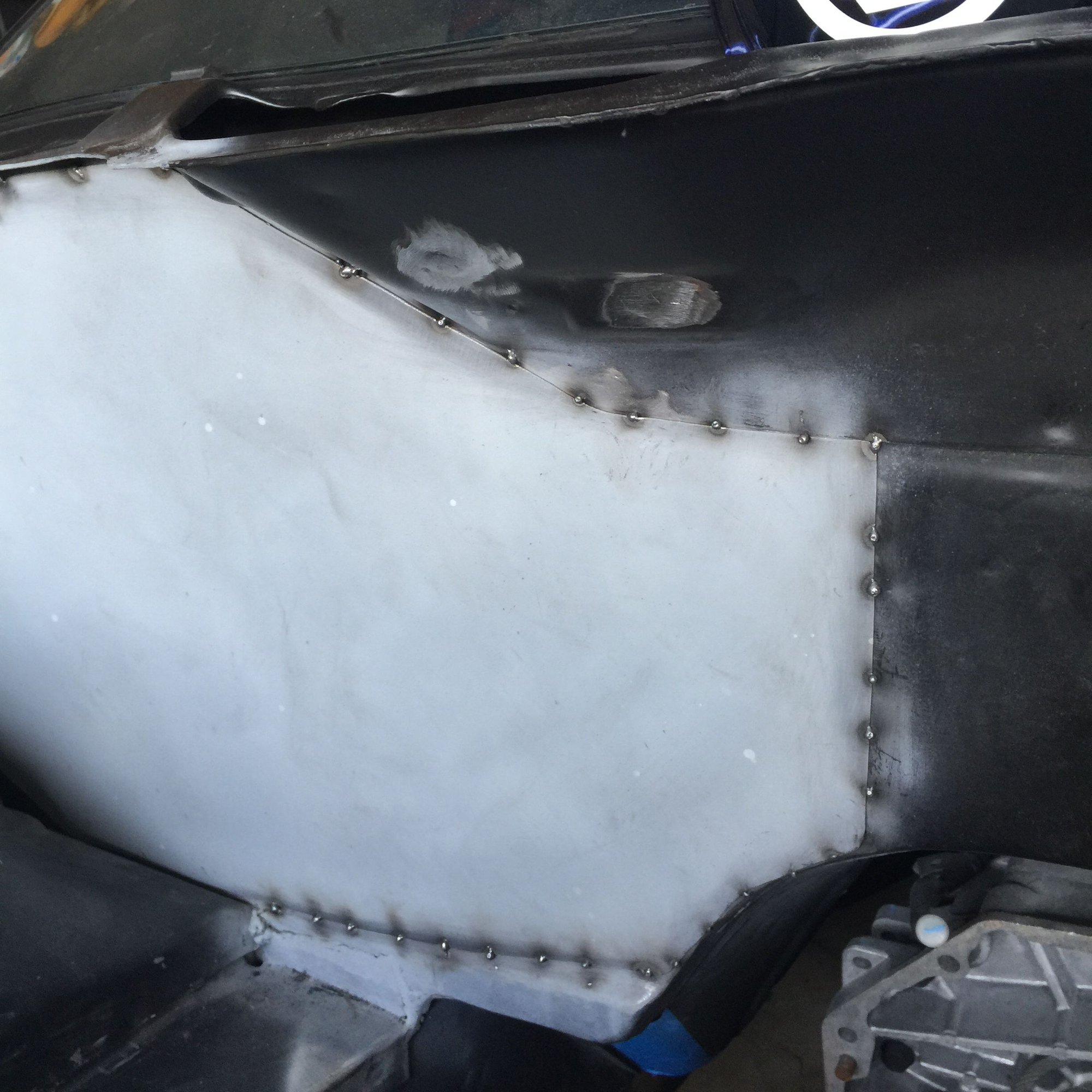 I'll post the engine bay progress to date and that will pretty much be it for past progress. I tried to install a set of rear hatch hinges and exploded the glass. I will be turning my efforts toward that for now. It's funny but, I have had those hinges on a wish list for years. Careful what you wish for. Anyway, first up is the firewall mods followed by inner fenders then frame rails. So much work has gone into this that recording it all here is unreasonable. First firewall panel installed First firewall panel drilled for plug welds