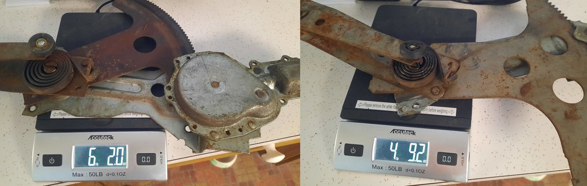 It's probably already on the forums somewhere, but in case anyone was wondering, here's the weight difference between the power and manual regulators. Just shy of 2lbs difference. Factoring in the wiring you can remove, and it I'm sure it hits the 2lb mark. Not that I'm going for weight reduction, but data is data.