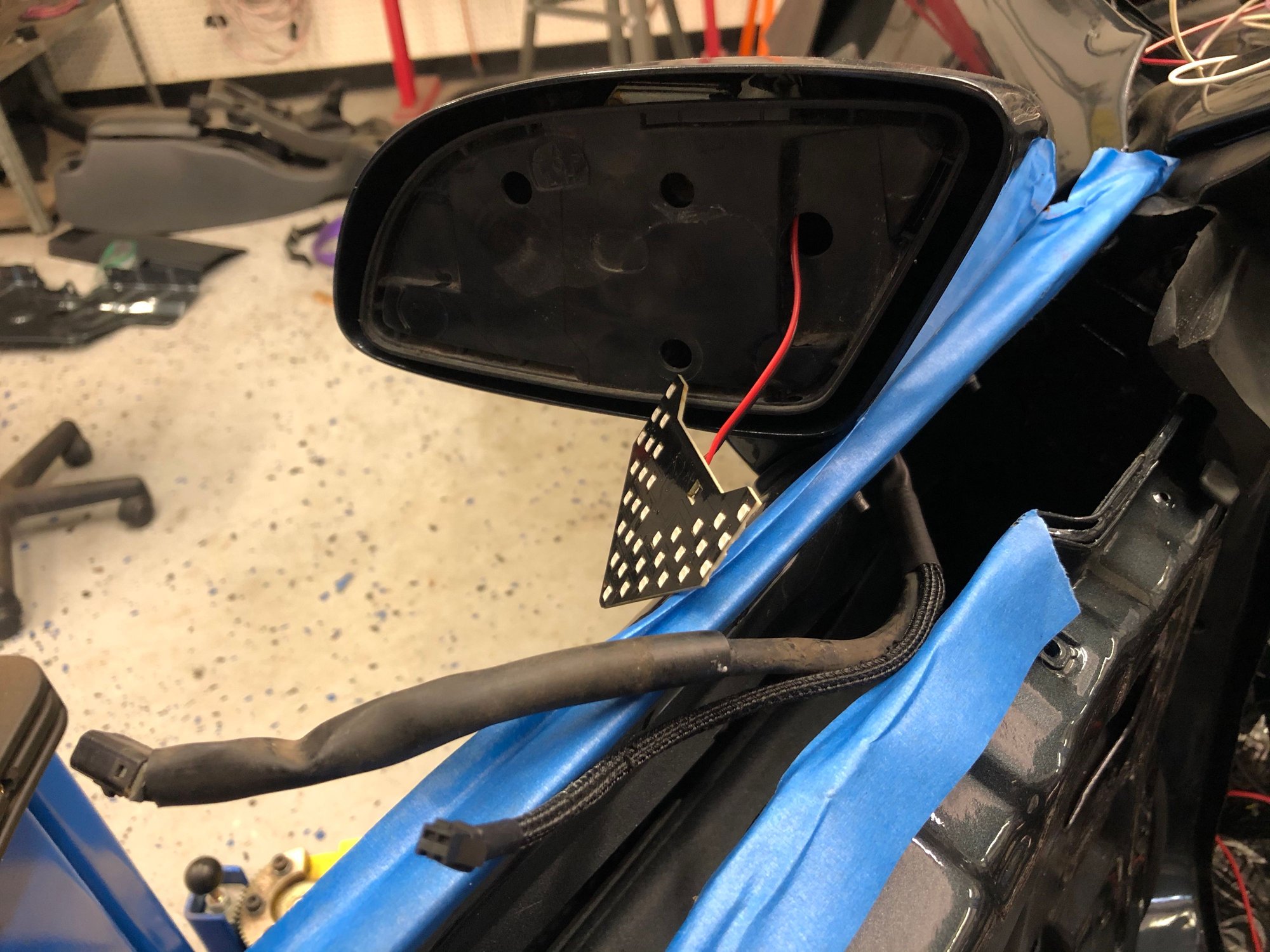 With the dash and infinitybox installed again, I could finally test the turn signals installed in the side mirrors . Here's a couple pics of the installation, followed by a video of it working.
