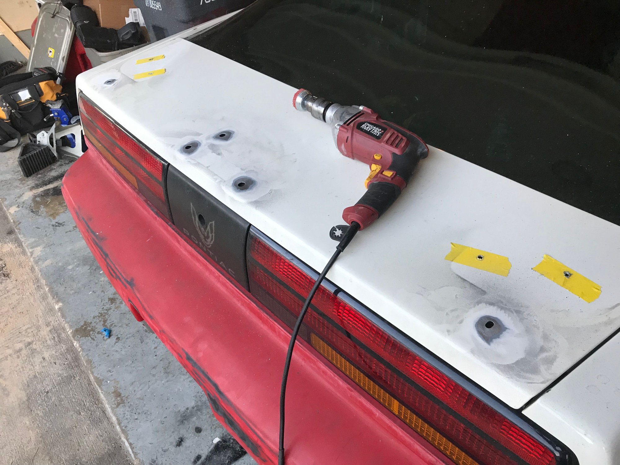 Currently, my trunk has three approximately 1/2 inch holes for the brake light and two 1/4 inch holes for the old spoiler mounting bolts.