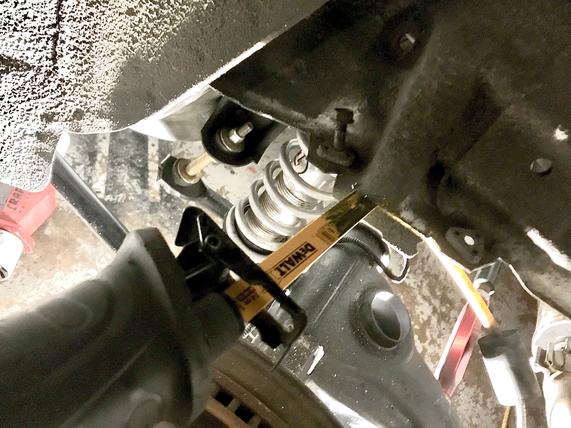 it turns out I was running into my bump stops. And of course, 33-year-old rubber makes a poor replacement for springs and shocks. So I pulled out the old saws all and fixed the problem by slicing 2/3 of the bump stop off.