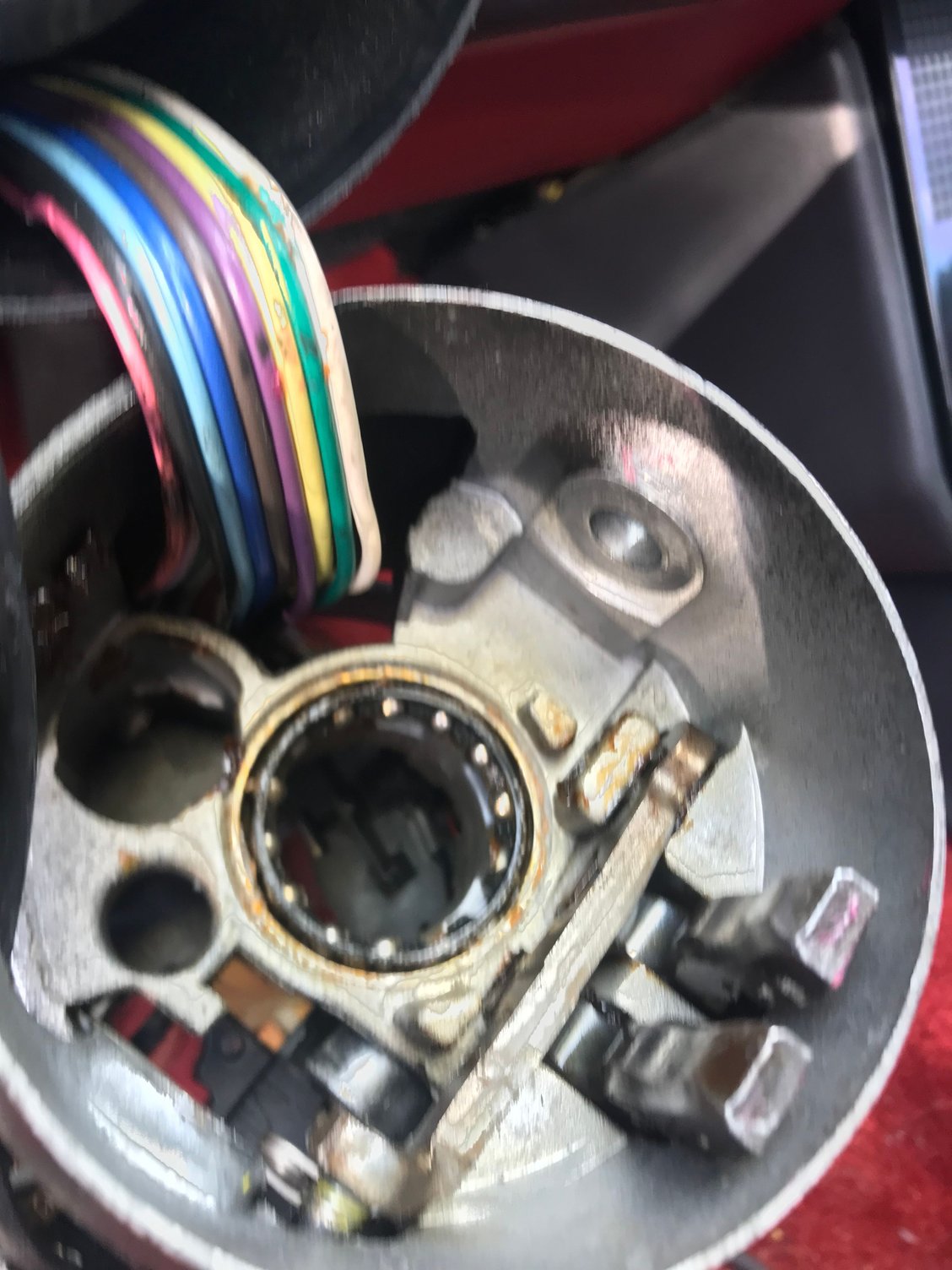 As I was figuring that out I noticed another problem. When I removed the steering wheel nut the shaft threads were damaged pretty badly. I’m still not sure if I did this somehow or if it had been done previously. And with the top half of the threads completely damaged it became apparent that getting the U-shaped tool to the press the horn plate was going to be pretty much impossible.