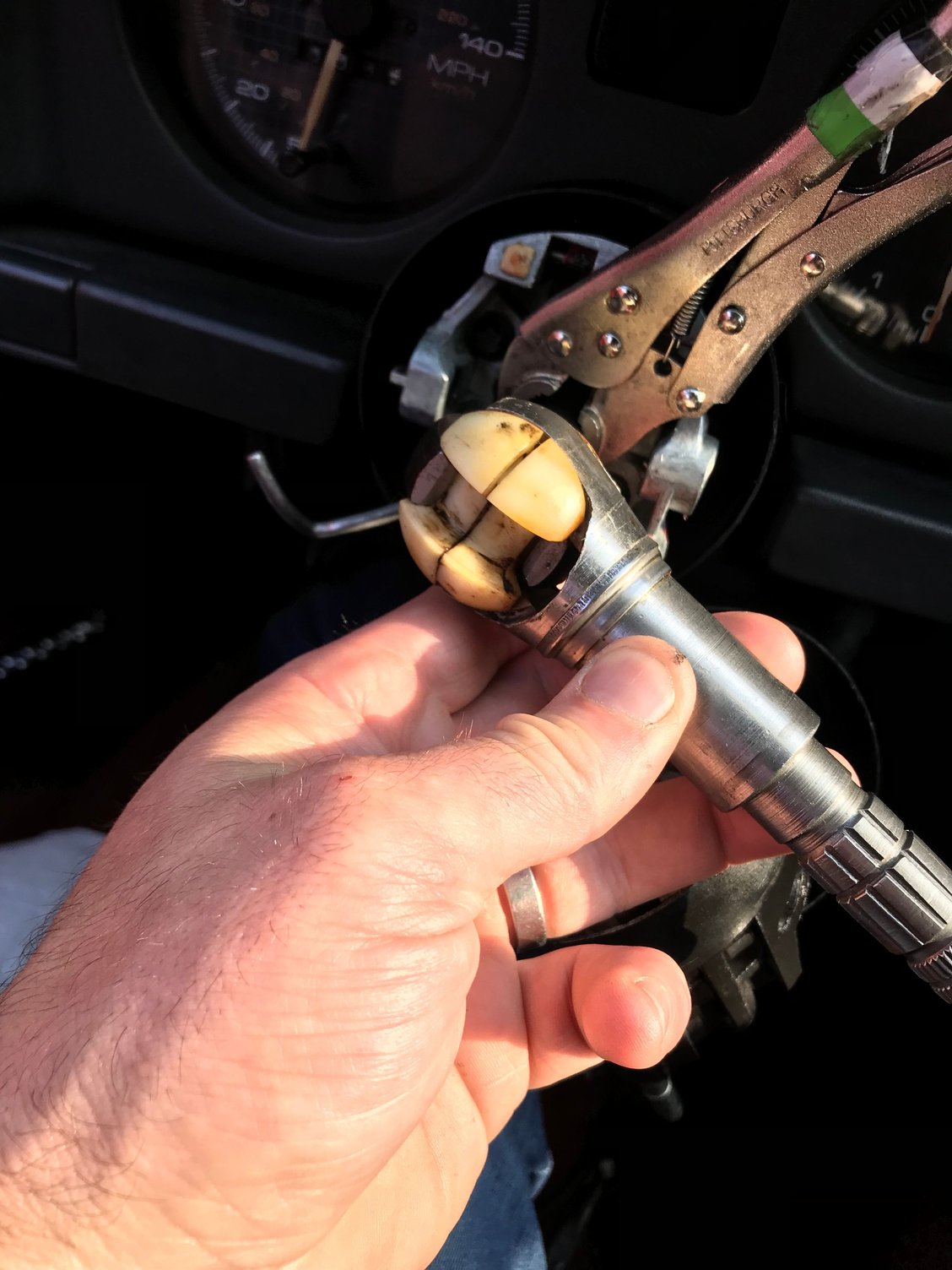 here’s a close-up for the process of attaching the upper steering shaft ball joint. However, if you look at the last picture you may be wondering how is it possible to get the column lock plate and column cover over that shaft. The answer is you can’t.