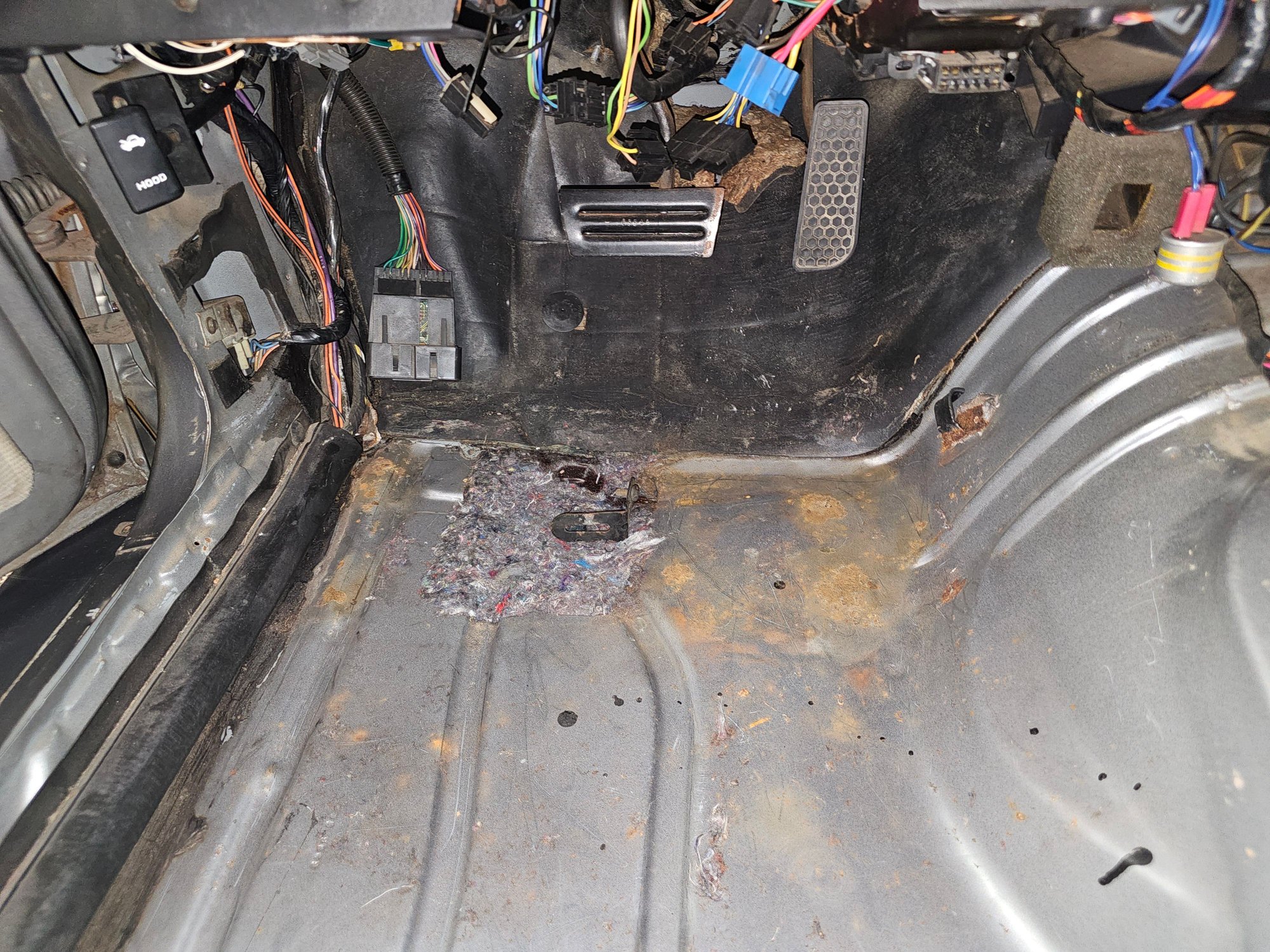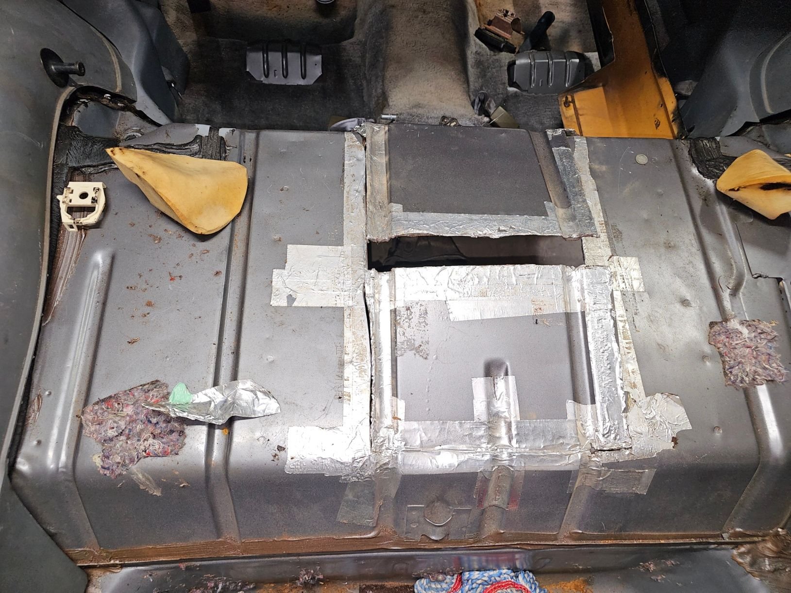 First things first, trying to get this thing started. When I turn the key on, no fuel pump prime... SO I pulled the carpet to CHECK for a fuel pump trap door and low and behold... there was. Behold one of the worst trap doors I have ever seen. Cut with a die grinder, and tapped back together with HVAC tape. So I dropped the tank and welded everything back together. I should Clarify here, I am NOT a fabricator, nor a welder. This was a very tough project for me. The gaps were very large, and I had to bridge the entire panel back together. the sheet metal was paper thin and I kept blowing holes through it. I eventually got my settings figured out and got it back together. The welds are ugly, but the panel is strong. In my opinion, I know that its not ideal, but... It's better than a trap door in my opinion. I didn't grind the welds down, but i cleaned everything, coated in self etching primer, multiple coats of paint matched spray paint and clear coat. This entire panel will be coated in Sound deadener, so I am not worried about the weld beads being present. I know this may not be the BEST way to do this, but I'm just a diy guy making it happen.