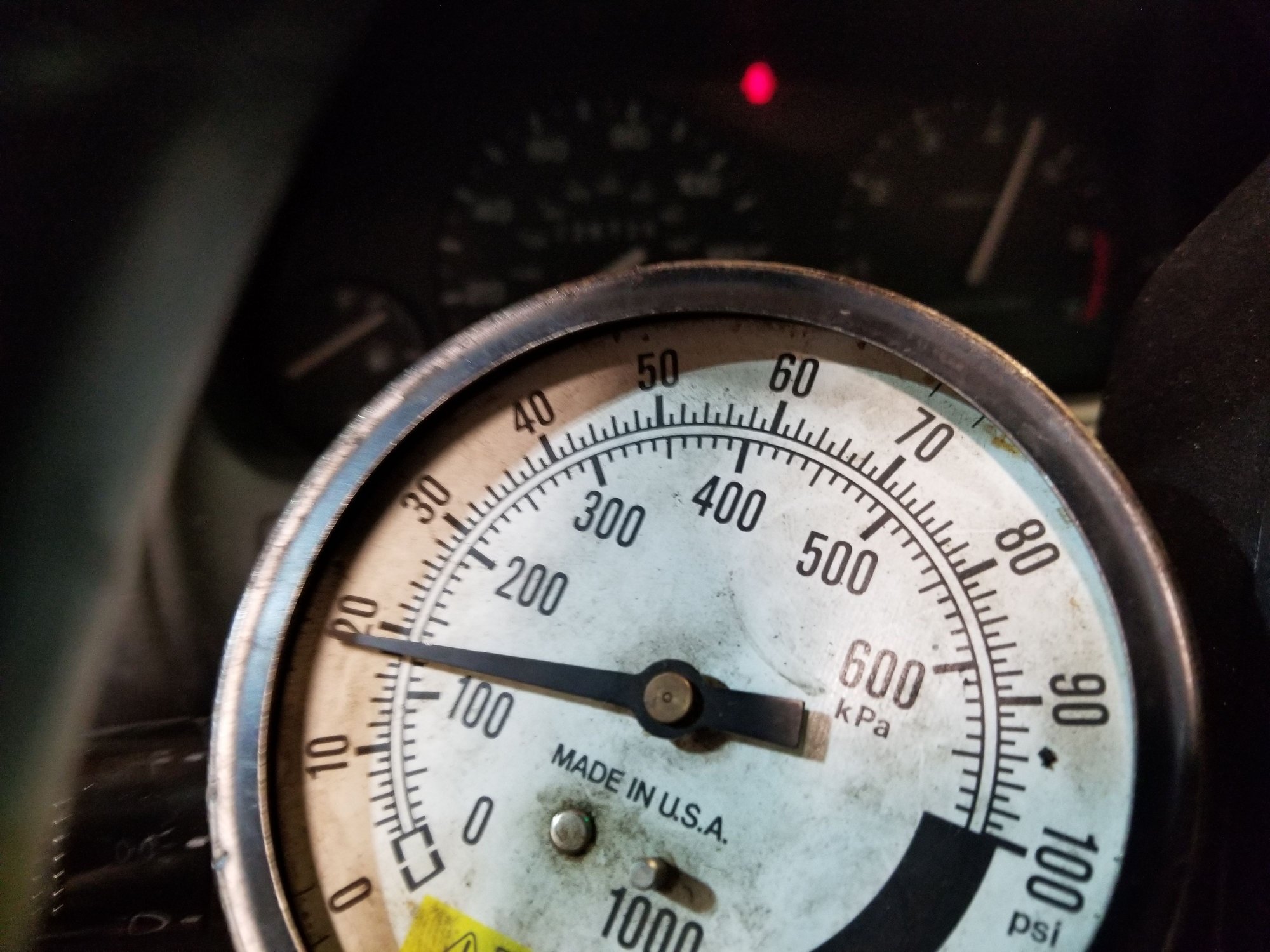 I had a hunch, so I ran a quick test; one that I've done before with conclusive results. I pulled the front O2 sensor, and screwed a compression tester hose into the bung, then slipped a long rubber hose over the end of that hose, and ran it into the car....and I hooked a fuel pressure gauge to it. Fired it up, matted the throttle in neutral....