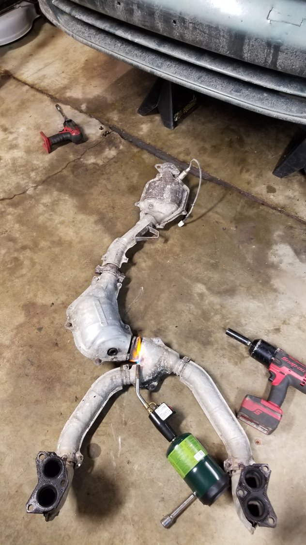I dropped the exhaust and separated the cats. Now, if @Fast355 sees this thread, he's going to be devistated that I didn't use goat **** on the rusted, 30 year old exhaust flange bolts! Nope, I committed a master tech faux pas and just used boring old HEAT to get those rusted, stuck nuts off...and....it worked!! Whaaaa??.....