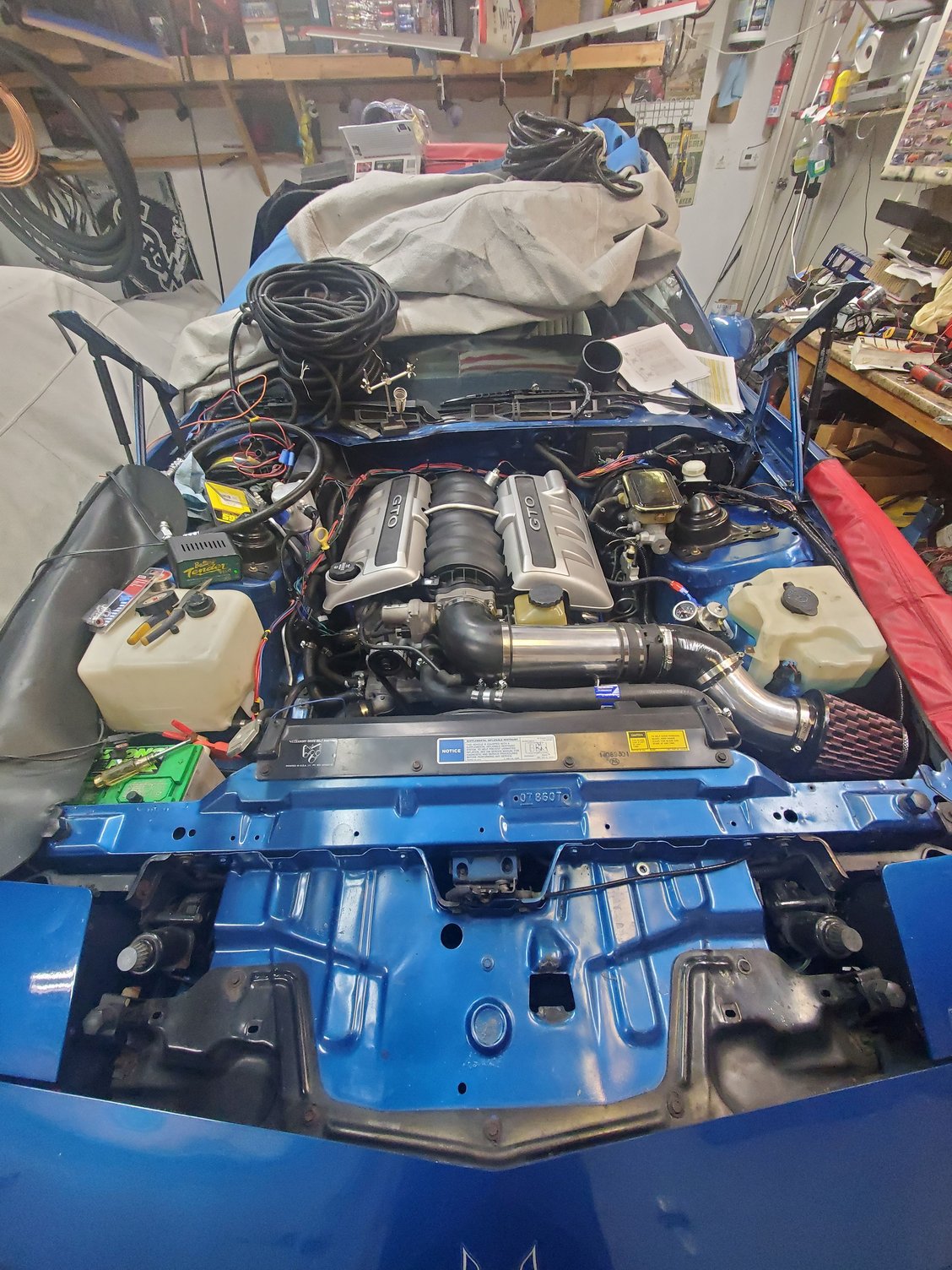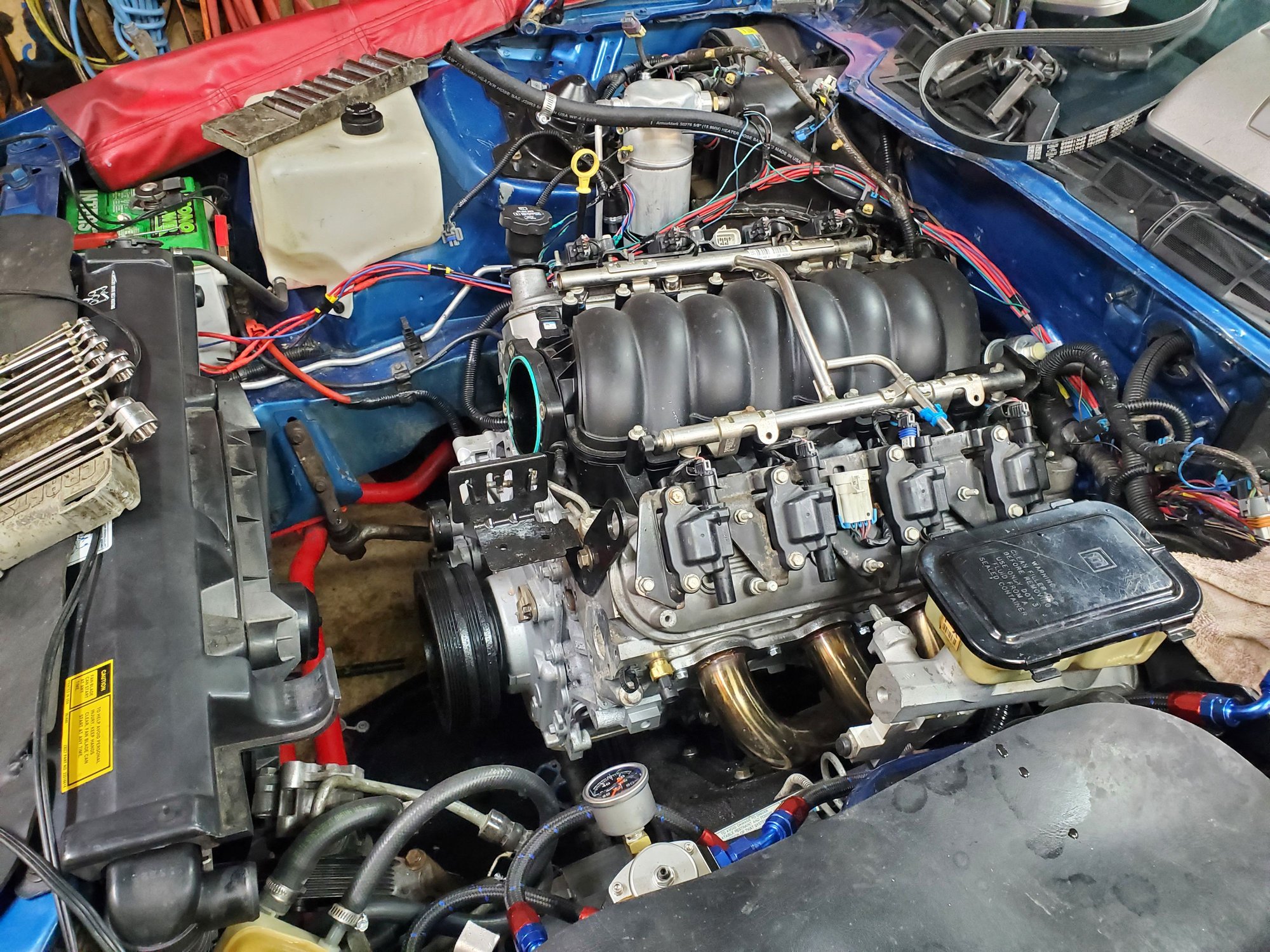 More done, found a topic on the lsx swap page on the heater core and kindof followed how they did the heater core and valve. Need to get the ac lines done next and get exhaust ordered when taxes come, but did get the ac and trinary switch tied in hopefully the right way. Also made a intake from a silverado ebay cai I modified the pipe and made a small bracket to hold it up, got the main console in and did a little cleaning and now can see the tool bench provided in front of the radiator.