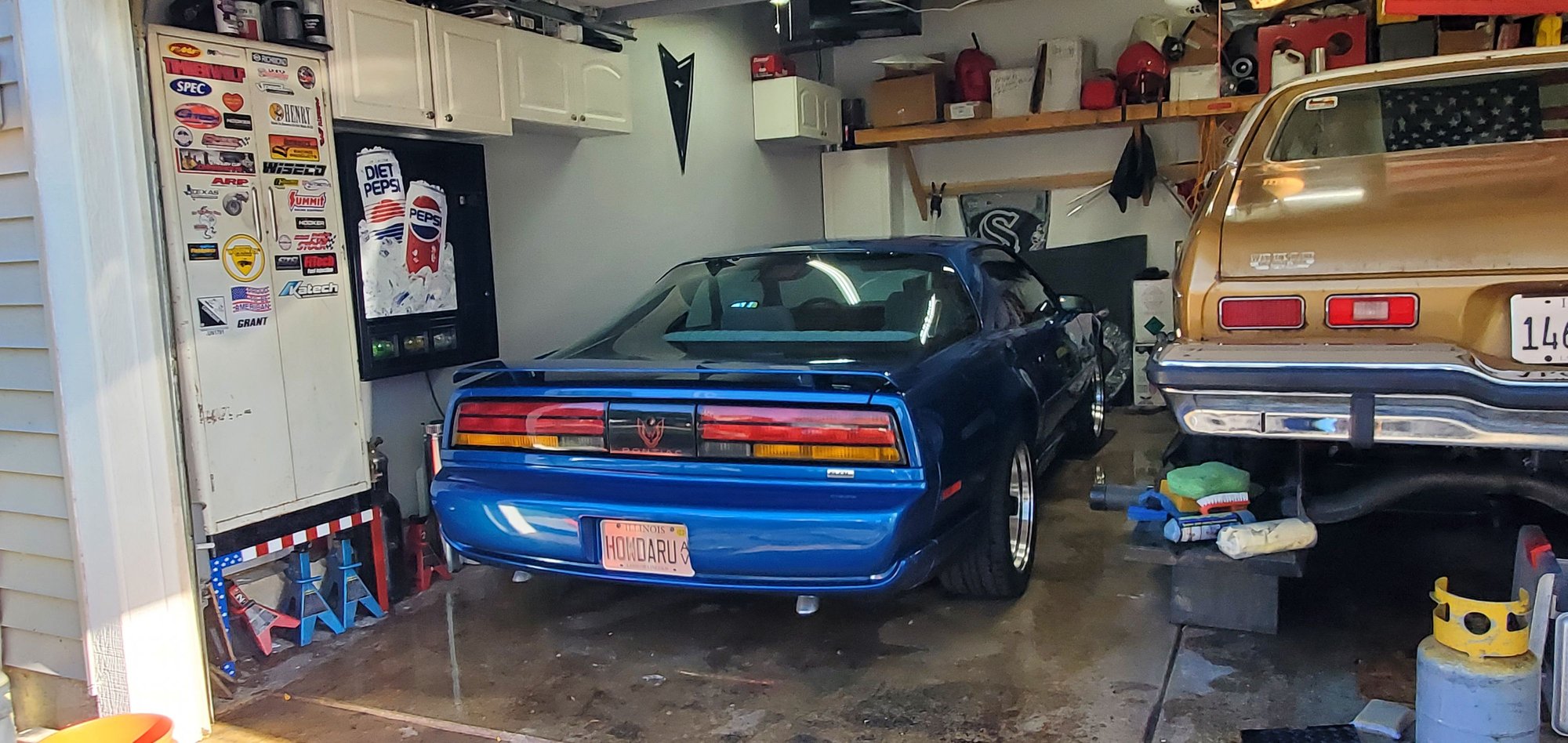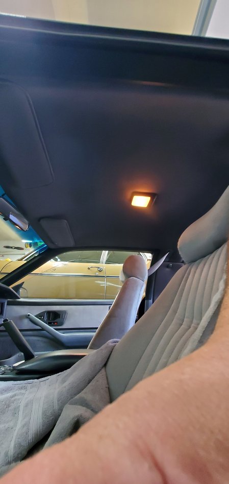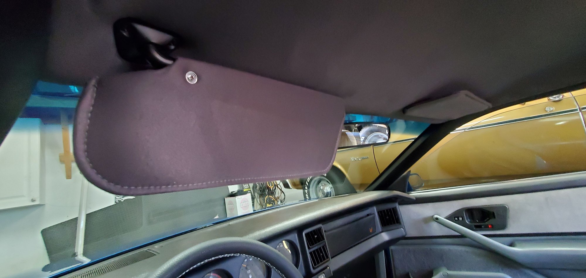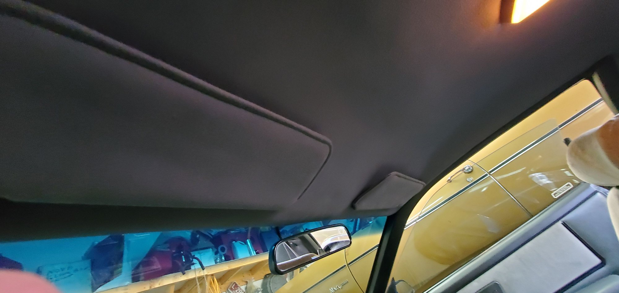 Old one was falling on my head and blowing bits all over the place, so had the local upholstery shop du-now do the headliner, visors and sail panels. Turned out pretty good the color he usually used was now discontinued so the next option was a tad bit darker but looks better in person than what the camera shows it as. Also washed the cars in the garage, and didn't bother cropping the pictures