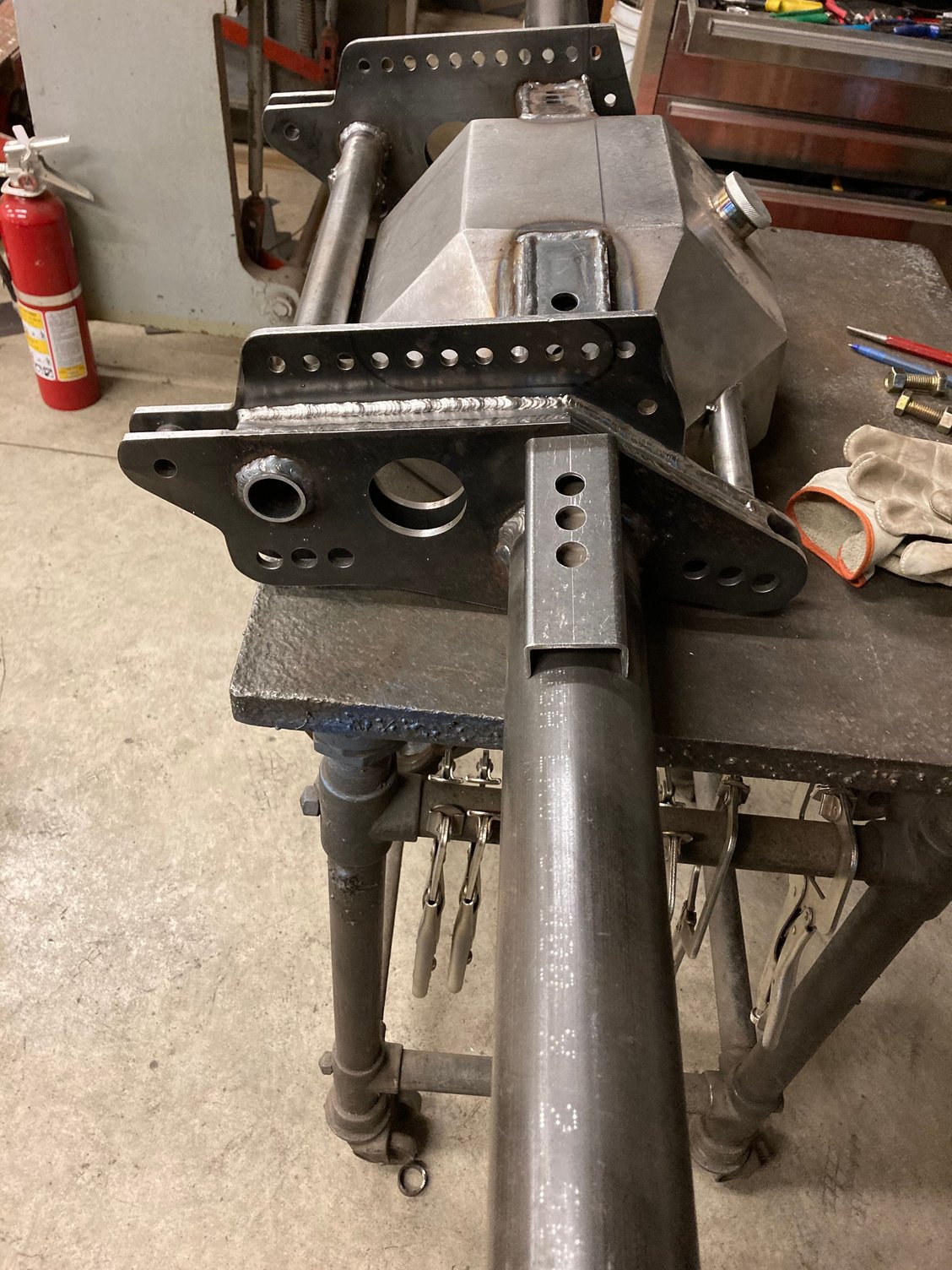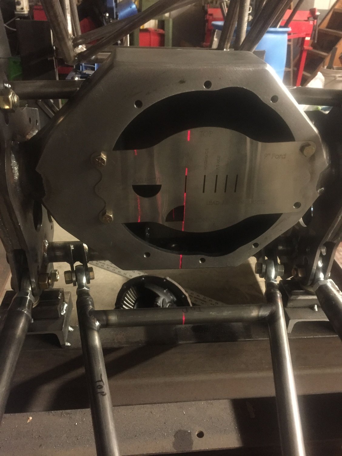Made some brackets from 1/4 inch plate Welded them to housing on a 2 degree angle Fabricated back brace from 1/8 Lazer says it’s centered . Wishbone in background Welded the brackets together first