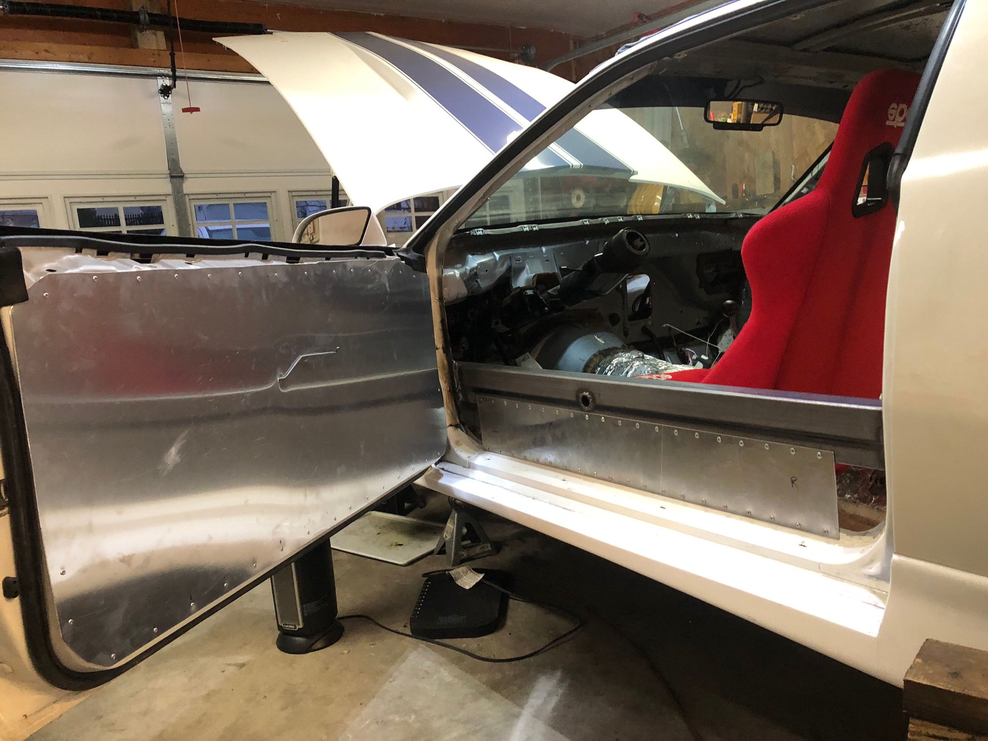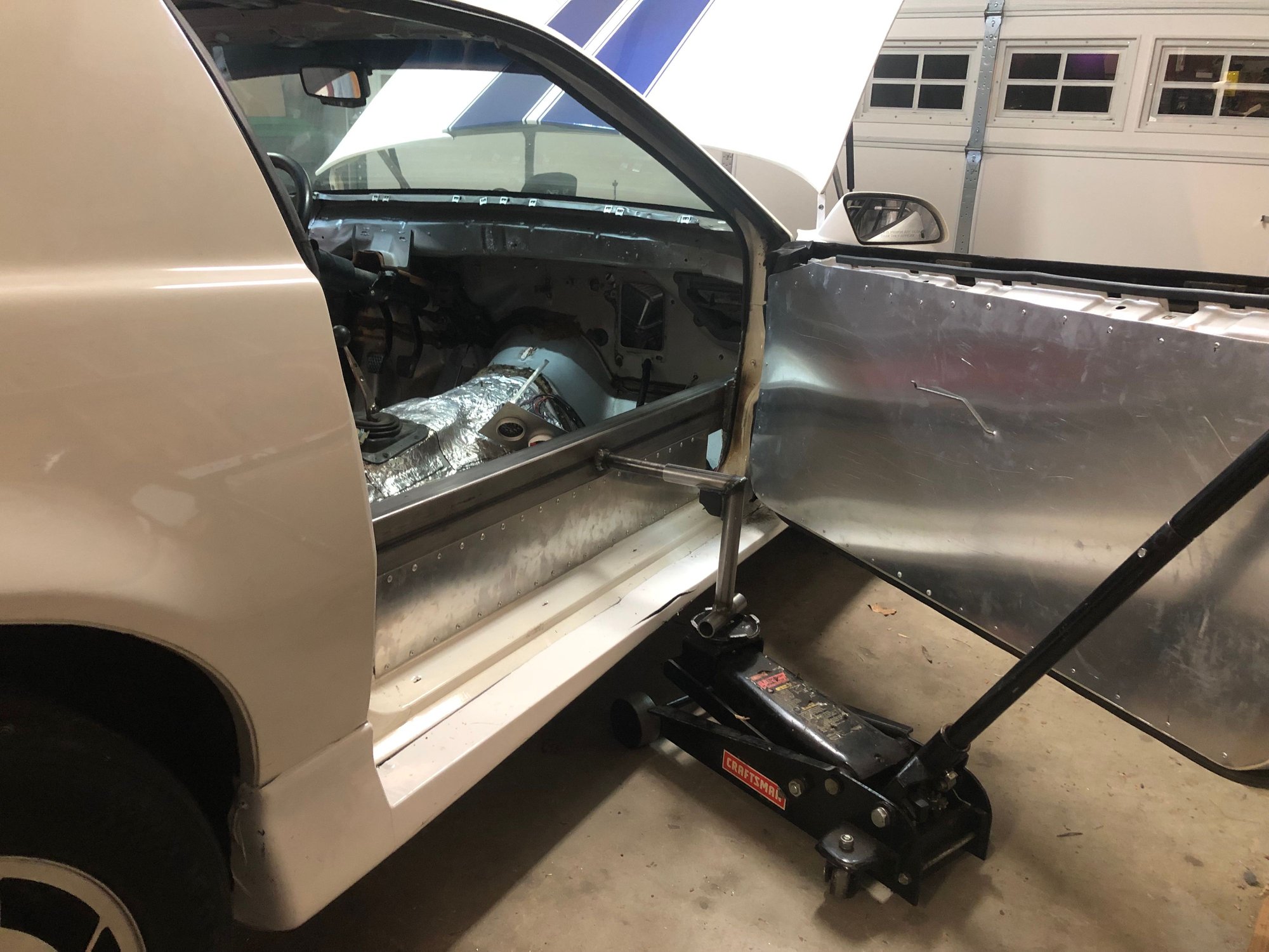 I thought posting some pics and description might be interesting to some like-minded thirdgeners. I wanted to stay away from a full cage, but, the chassis needs bracing and I'm too old to scrounge around on the concrete finding a place to jack up the car. The door bars are 2x4x.083 steel tubes, welded in at each end and then riveted to the door sill with .060 6061 aluminum. Most of the rivets are 3/16 CherryQ structural rivets. The jacking system works, just don't shim with a piece of wood. See the crack in the rocker panel aero.
