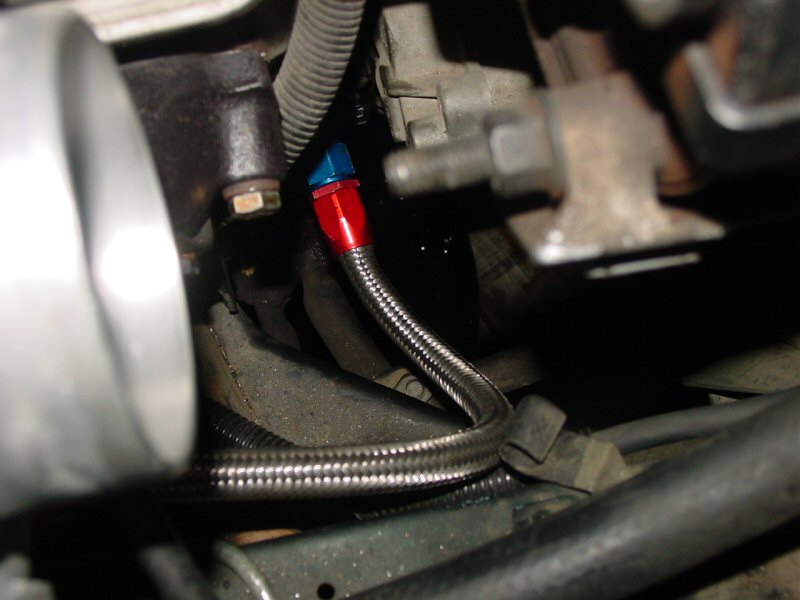 My return line isn't kinked, but I had to really work it to fit in there. There is one part that is horizontal, but it never goes up. The line goes to the fuel pump block off plate. The intake line is off of the driver side, T'd in w/ my oil pressure sender.