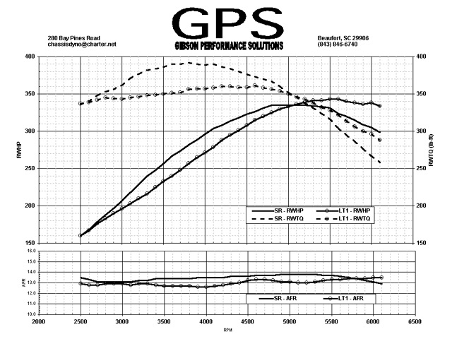 There was a comparison done with a superram versus a LT-1 intake, I would love to find the cam used in this test. Here is the chassis dyno sheet: