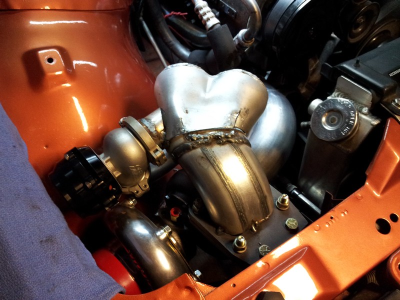 I bought the twin turbos with upward facing headers and wastgates for my setup, since others didn't like that forward style headers, I don't want trouble with serpentine setup or steering or other things, so I chose to cut holes in the hood too. I'm about to order a 50mm bov too, turbos come next monday