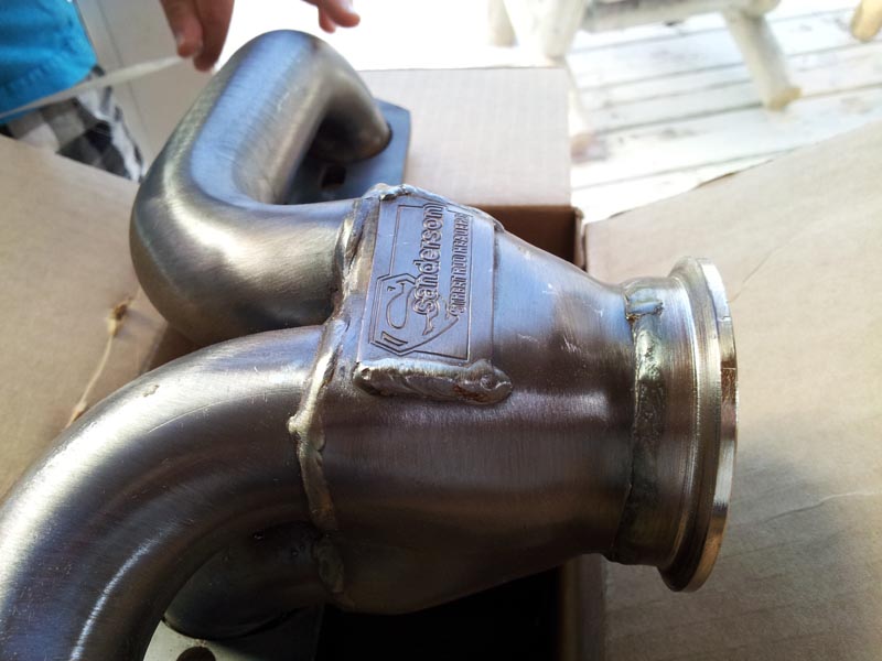 Some shots of the downpipe. I made it in two pieces so that the lower section can be easily removed (2 v-bands) to allow access to the spark plugs when needed.