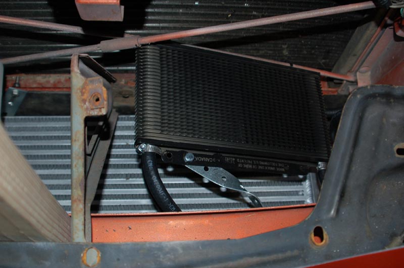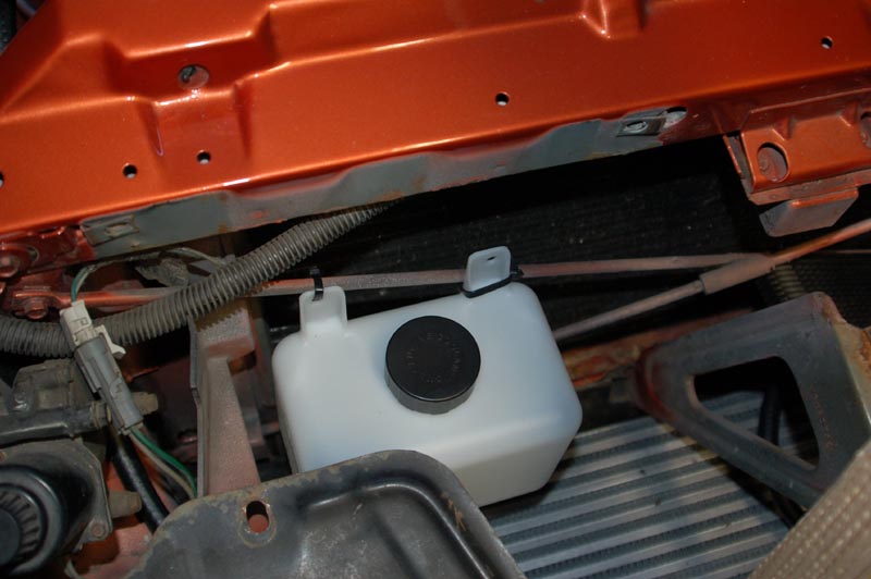 I also had to remove the stock coolant overflow jug, so I installed a smaller, aftermarket one in the space in front of the radiator. I also installed a transmission cooler in that same area to use as a power steering cooler, since the stock cooler (which was just a loop of tubing) wouldn't fit well with my dual fan setup.