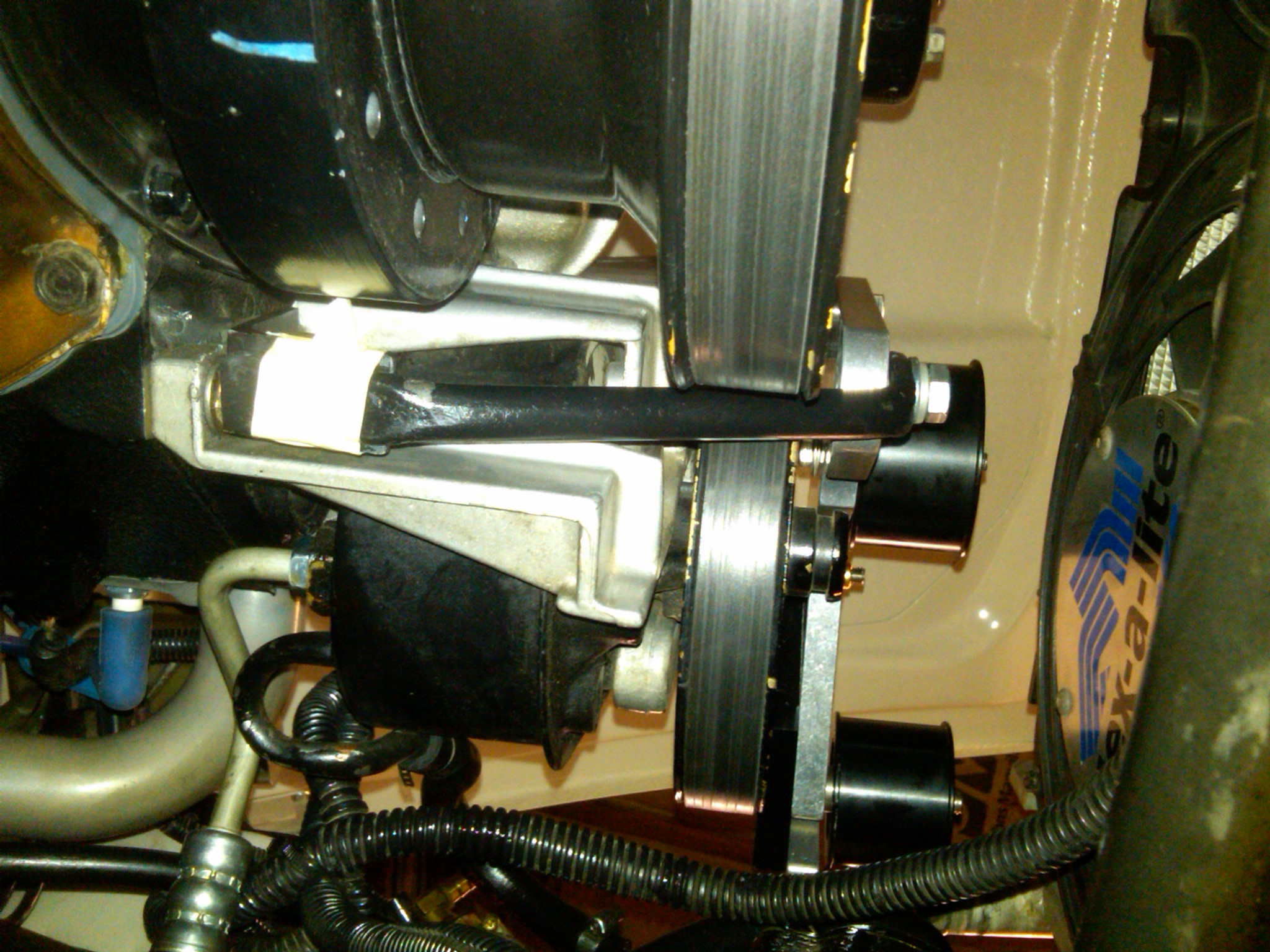 With regard to the spring tensioner location, you want to make sure you have it positioned so that tensioner can move in both directions. They do "adjust" themselves (meaning you won't have too much tension on the belt), but you want to make the tensioner will compensate for belt flex under WOT (wide open throttle). The manual tensioner that comes from procharger is "OK" if you are only going to run 7 to 8 pounds of boost. Anything more than that (in my experiences) the belt starts to slip and you have belt dust all over the place. I've found that 13 to 14 is about the limit on a 8 rib belt. I've gone as high as 18 to 19 pounds of boost, but the belt starts to slip again. My next step is to switch everything over to a 12 rib set up hopefully I can run 20 pounds of boost with no belt slip. With the electric fan set up that I run I don't have enough room to go to a cog belt set up.