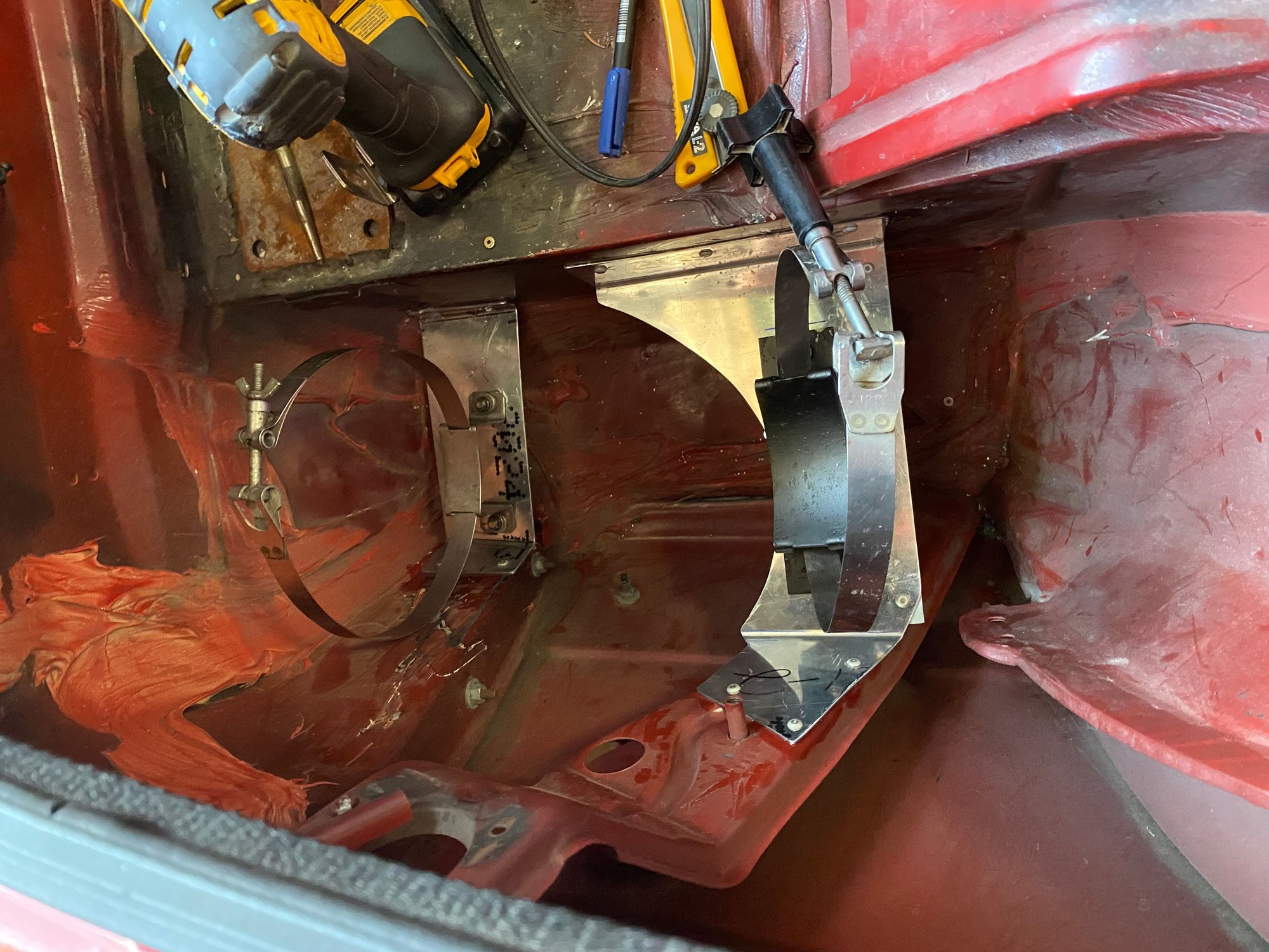 I made a mount for the bottle in the spare tire well. I have seen many ways to do this, including nesting the bottle in spray foam. That’s not how I did it. See below: I made alum mounting brackets to bolt the bottle brackets to and used sealant and rivets to mount this arrangement. The OEM spare tire cover fits over it ok.