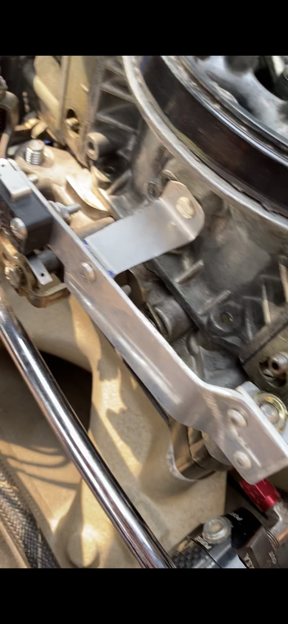 The next part was mounting an activation switch. I felt the best way to go was on the carb, WOT activation. I bought a micro switch with a lever at the local electronics supply store for $4. I then mocked up where it should reside on the carb and fabricated a bracket to hold it. I had already juggled the solenoids around and found an arrangement that cleared everything as best it could, and ran the wires accordingly.