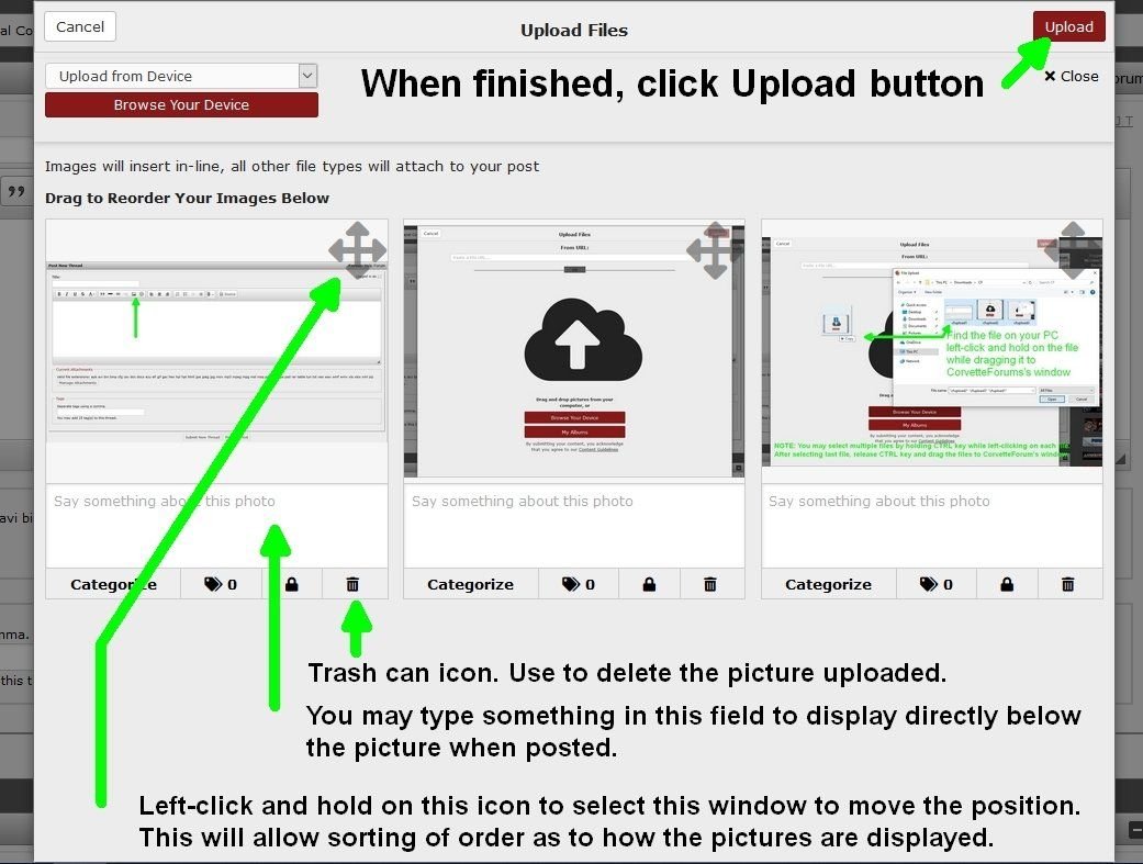 4) The picture will immediately upload to ThirdGen.org and a thumbnail will display once finished. You can then type a description to appear below the picture, which will appear directly below the picture in your post, you may re-order the display of the pictures, delete the pictures, or continue by clicking the Upload button as shown in the illustration below:
