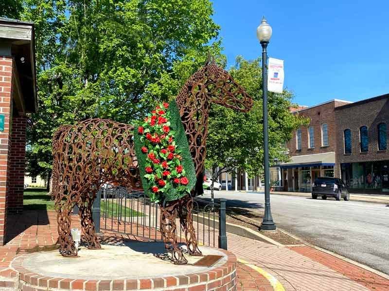 Old Simpson County Courthouse on the Square. Cherry blossoms in spring. Melvin the Magnificent made from horseshoes and chains by students of the local high school. We do have Kentucky Downs horse racing track here. The only European style natural turf horse racing track in the United States.