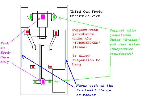 For the front, after I block the rear wheels, I use a jack under the k-member, and put jackstands under the "inner" ring of the spring depressions of the lower control arms. And again, I lower the car onto the jackstands slowly, and test the car before I get underneath.