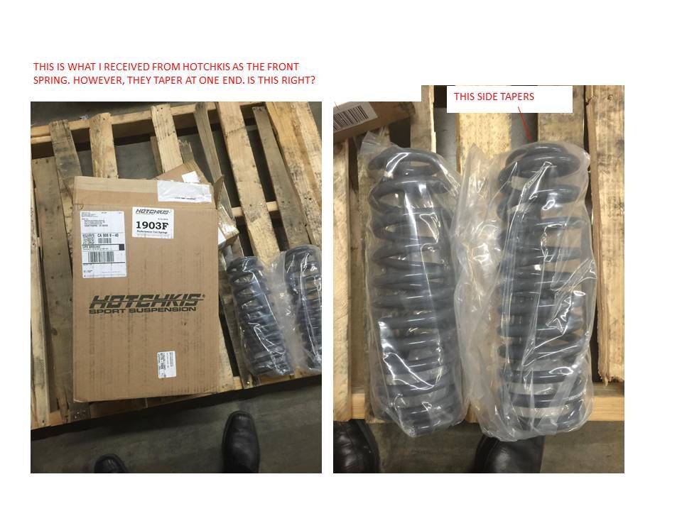 I purchased these 1903 Front Springs from Hotchkis. I showed them to my mechanic and he said they're the wrong ones and that the front springs are supposed to have the same diameter at the top and at the bottom, and if they taper, they're probably the rear springs. However, after sending them back to Hotchkis, they insisted they were the front springs. Does anybody know what's going on? Are these the front and if so, why do they taper? Can I still install them?