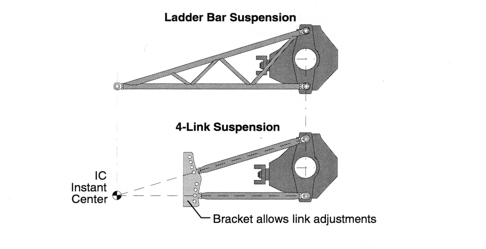 As far as instant center goes, a traditional torque arm (NOT WHAT WE HAVE), the front pivot determines the instant center, it is the instant center and the lower control arms are inline with the axle so they don't do anything but locate the axle fore and aft. A sliding link torque arm is what we have and the front link sets a vertical line which a second line drawn through the pivots of the LCA's crosses that line is the location of the instant center. So basically the fore/aft location of the front mount and the angle of the LCA's entirely determine the instant center, it doesn't move fore and aft like it would with a 3 or 4 link suspension.