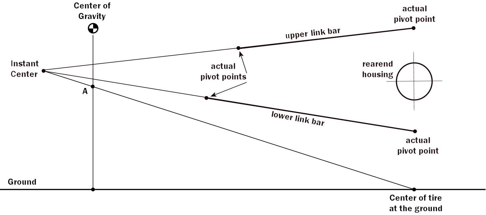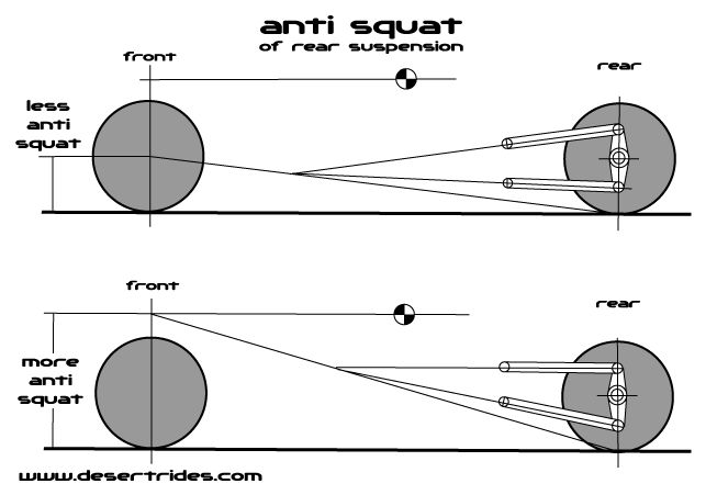 * Torque arm length: Shorter torque arm moves instant center rearward and will increase anti-squat a lot, and vice versa. It's a strong factor. Be careful because you can induce brake hop.