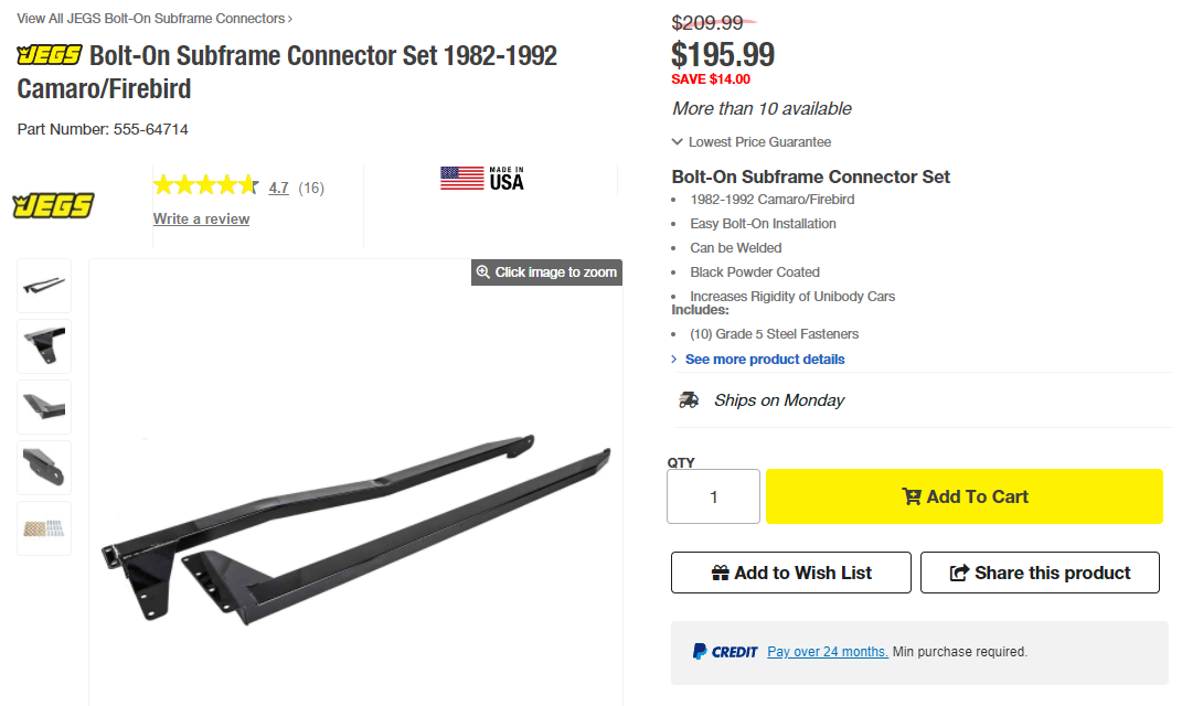 Outer subframe connectors aren't just welded to the ends, but also stitched to the body seam all the way down the length of the bar. That's how it adds rigidity. Most people don't realize that and just weld the ends in place. It should also triangulate to the trans tunnel. And it should box in the lower lower control arm mount. Pass up products that don't do all those things.