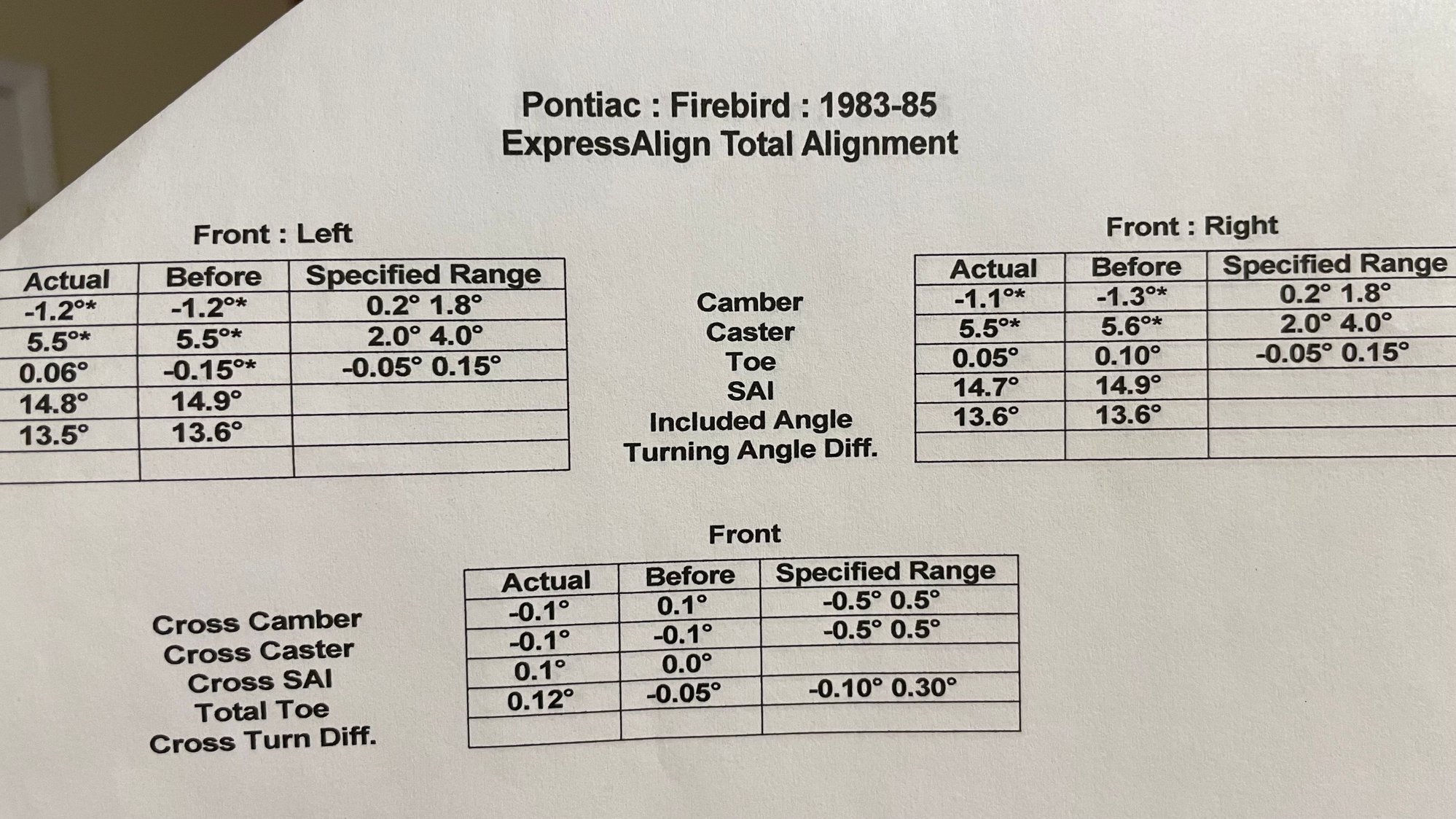 Flattening will solve nothing. Metal will have to be removed. Simply flattening the lip will still have it in the way and getting smacked by the strut next time I full-stroke the front suspension. As for anything “wrong” with the car, it is straight and nothing is wrong with it. I was a little off on my caster, it’s 5.5*. The damage and where the strut resides to get that 5.5*. Alignment specs.