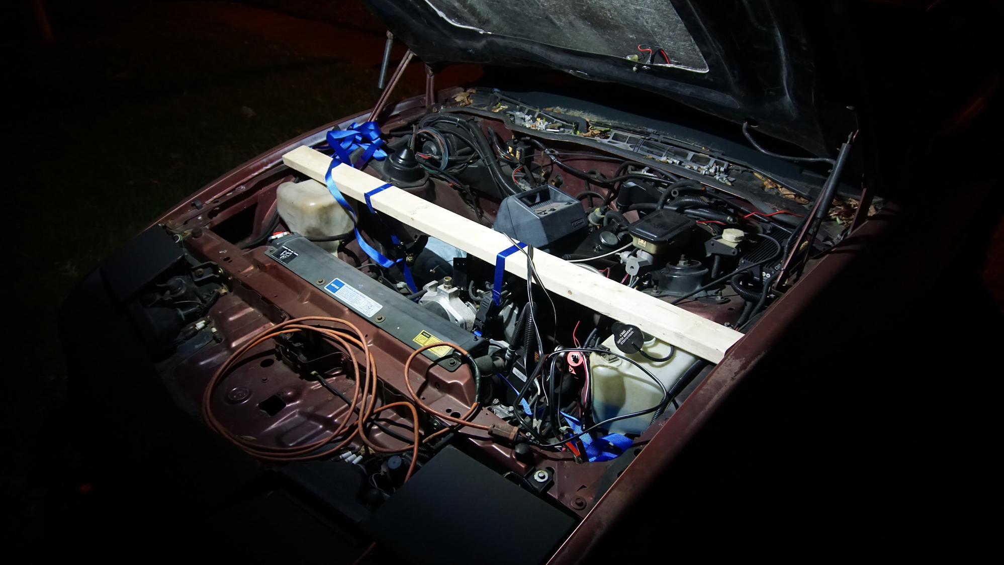 In the future, I cut a 2x4 the length of the space between the fenders, strapped a couple of ratchet straps to the front of the cylinder heads, and I was able to lift the engine off the eventually to install a new K and suspension. It was surprisingly not in the way, and a single strap could have held it, but I liked the security of 2 straps in case one let go