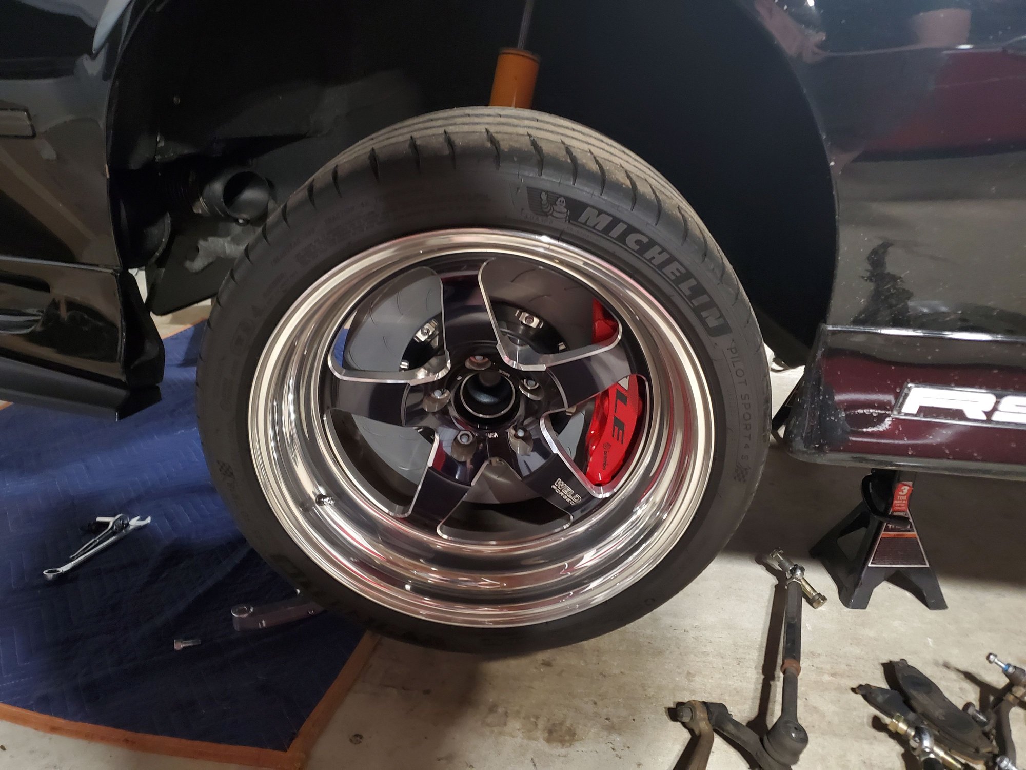 The spindle bolts on just like the OEM spindle using the lower ball joint and the factory strut location. The wheel bearing is positioned with a billet spacer to keep the same track width as the factory third gen had. If you have custom wheels already you should not need to change them to fit. Alternatively, if you are looking for a deeper front wheel you can push the bearing further in and run it without the spacer... this lets you have a deeper wheel but will not work with factory spec'd wheels.