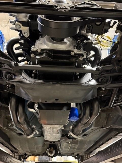 After thoroughly cleaning up the oil pan, I put everything back together and now the oil pan fit without contacting the right, rear of the windage tray. I tightened up all the oil pan bolts and my wife and I installed the engine back into the engine bay. A day or two later, I stabbed the transmission and it's now all back together with the Holley transmission crossmember in place. The front of the oil pan fits the car and DOESN'T contact the steering rod!