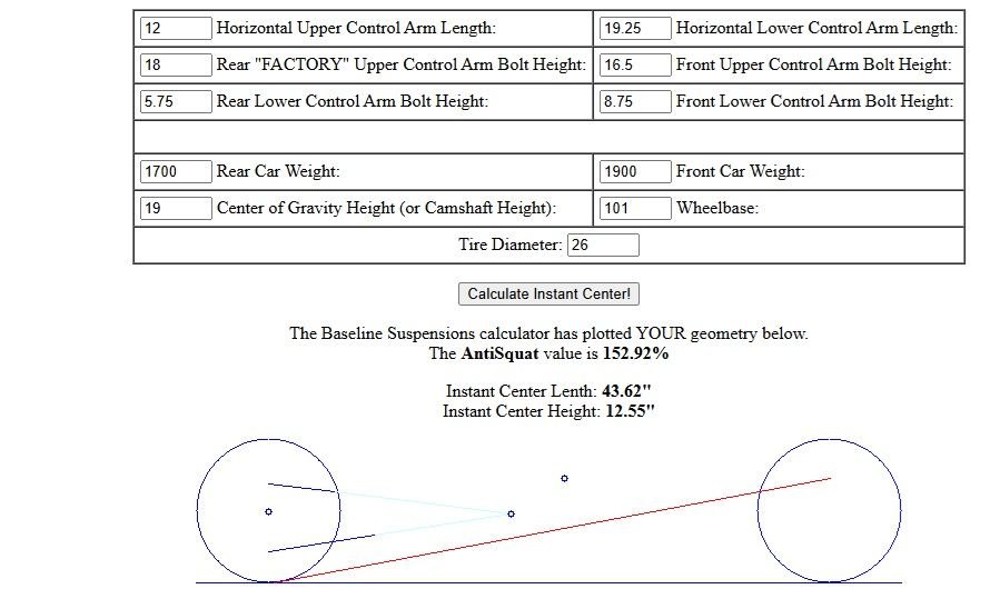 I can reduce instant center to 154 by moving the lca up 1" in the back OR the front mount of the upper bar up 1".