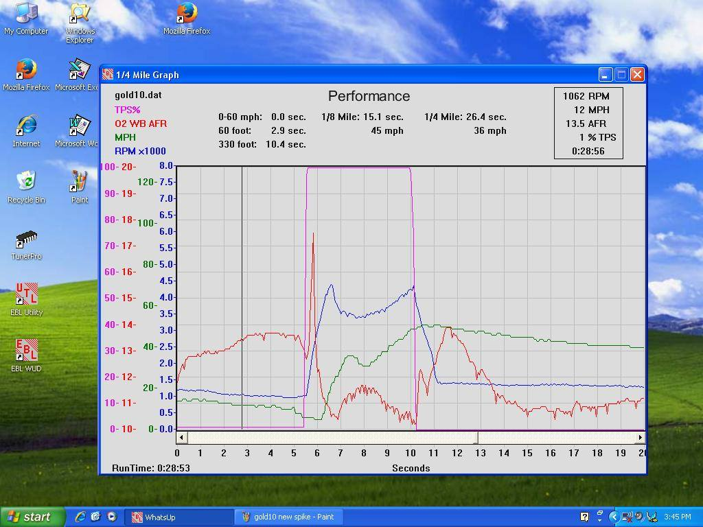 Chasing a lean spike I get at WOT followed by knocks ("84 Crossfire Vette, 383 Stroker, Renegade, 80# Inj, VRFPR @ 28psi, EBL ECM,). Nothing I do seems to have any affect on the spike which occurs momentarily from a standing stop WOT action. In fact increasing AE time and strength has a negative impact on 0 to 60 times and added a second lean spike shortly after AFR enriching, go figure. Anyway, I noted the injector duty cycle % are 50% or less during the initial leaning out event. Duty cycle increases rapidly there after and AFR's shoot up from 16:1 to ~10.5:1. Thinking I've got to those injectors working harder at the initial moment of WOT- right? How do I do that? BPC values? VE tables? __ ? Have jacked VE's that also seems to have a negative impact on performance. BTW overall I have it running rich and am reluctant to drop it because of the knocking... Graph - (Before AE jacking)