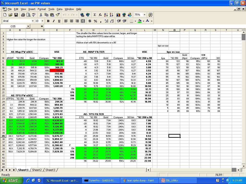 Hmmm, no ideas? Well looking at the spike it appears momentarily to start enriching then leans out fast. Told it's the thirsty Renegade surface area which requires a good shot of petrol at the lower KPAs and that makes it an AE fixable issue. Tried that and it resulted in poorer performance and no improvement in the leaning. . Below is spreadsheet that illustrates the values I'm playing with. The "USE" column represents the attempted BIN value fix while the "Gold" column represents the baseline. Green highlights, I believe, are the operating areas where things go bad. So, just soliciting some advice from anyone who has been down this road before. Also wondering if my vacuum referenced fuel pressure regulator is contributing like in not reacting fast enough. Maybe I should try running it without the vacuum function. Jump in, cuz I'm running out of things to try... Thanks.