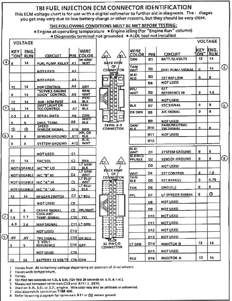 I have 1988 Chevy Suburban 5.7L, TBI, that have been fixing up. When cranking I have no injector pulse but can spray starting fluid and starts and idles fine. The truck wiring harness, distributor, oil pressure switch, fuel pump and ignition switch are all new. When I turn the key on, I can hear the fuel pump turn on for about 20s and then turns off. Won't start with TPS unplugged. I used the attached ECM connector identification to check voltages in/out of ECM. Pin D14 and D16 for injectors do have 12v with ignition on but when engine is cranking they drop to 0 volts. Is that correct? Also, pin C2 only has 0.6V not 12v like diagram indicates not sure if that would make the injectors not pulse but everything else checked out fine. I did buy a remanufactured ECM but still have the same issue. Not sure what else to check but any help would be greatly appreciated. Thanks,