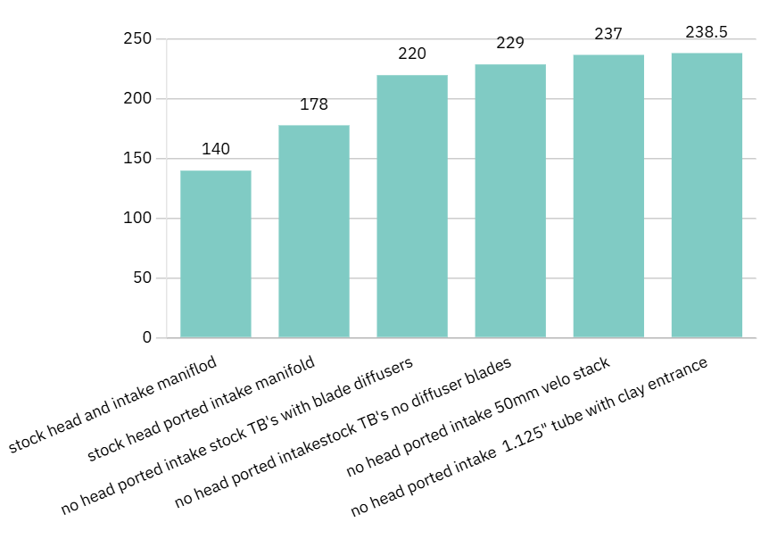 ported intake bottom with 100% stock top flowed 220 cfm with blade diffusers and stock TB's. no gains from bigger TB's.