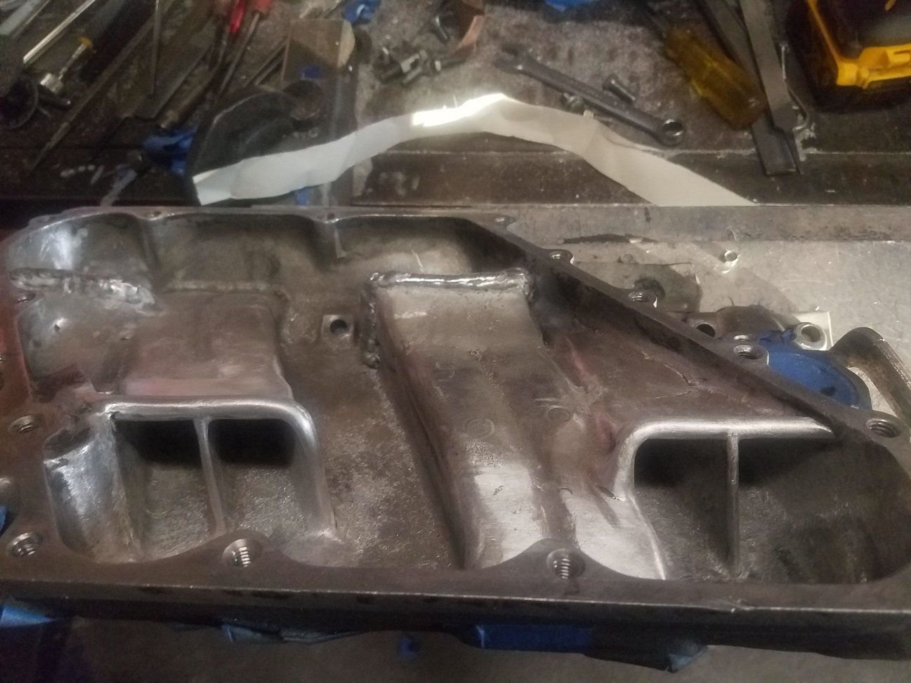 my advice to anyone porting an intake, buy another intake to port so the option to go back to stock is always there. I still have all the stock parts in a box. advice if welding, don't weld to floor or sides where top mounts to. Can weld right up to it and not weld it. to thick, could cause warping. port runners before welding. thin walls are easier to weld.