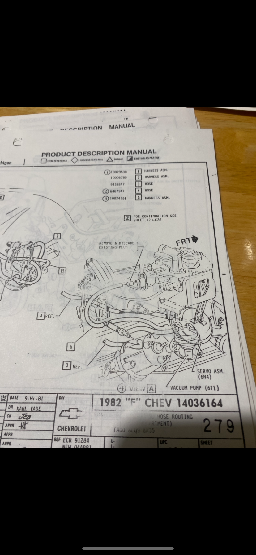 Hello and thank you for responding. In regards to the factory vacuum routing decal, no. If there was one, there isn't now. I have the factory books for an 82 but, they (as you probably know) cover many variations. Heck, I never knew they made a carbureted version of the 2.5! My problems began when I didn't know where the one hose that goes to the air cleaner housing went. After finding the diagram of the TBI that showed what connected to the different piping on the front of it, I was able to figure out where that hose went. However, I also found out that someone else had several of the other lines connected to the wrong ports. So I got everything switched to where it was supposed to go & ended up with two new issues. First, there is a fine metal tube that runs along the base and 80% of the length of the valve cover. On the front end (towards the front of the engine) a rubber hose attached to that metal line, was attached to the TBI... which according the the diagram, was incorrect. So, I have that line hanging out in space & have no idea where it goes. Second... and this is where it really gets interesting, in the diagrams that clearly show a drawing of the TBI unit, it also shows a simulated cut away of two modules underneath the intake manifold. One is a Vacuum Pump, the second is a Servo Assembly. I'll upload a pic & move on from there.