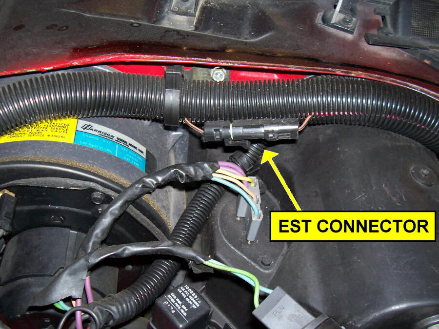 The EST bypass connector is in the engine compartment, along the firewall. It is a single wire connector in a tan/black wire that should be near the HVAC blower motor: