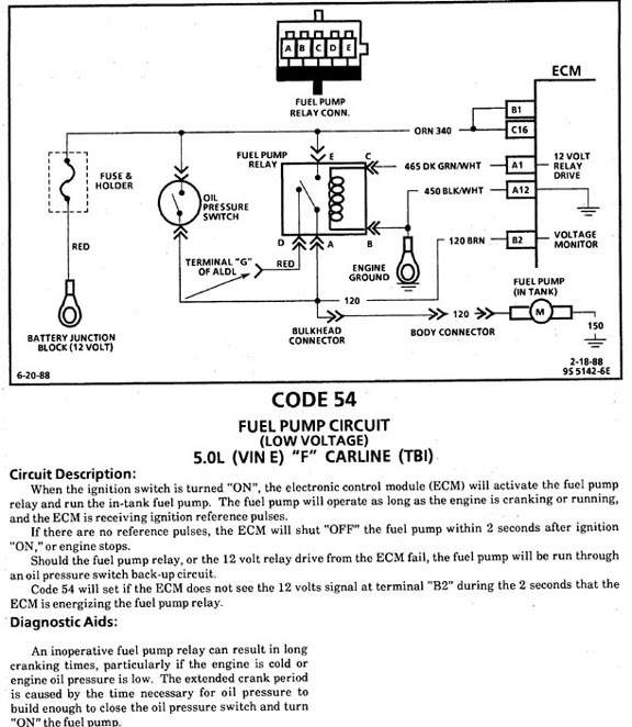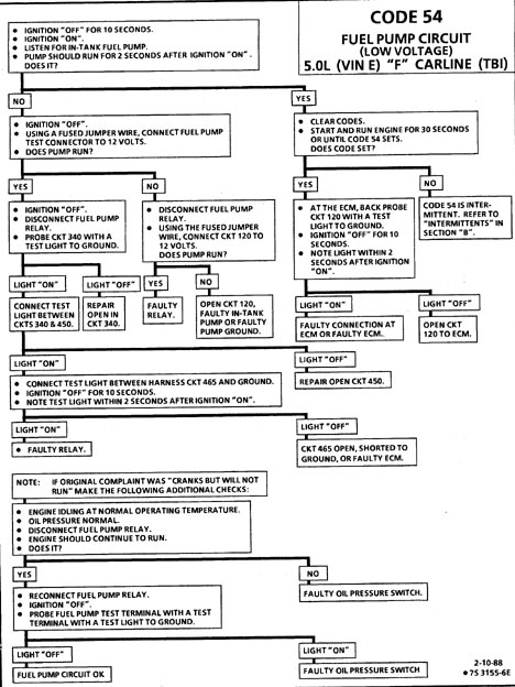 Here is a test for code 54. Connect 12 VDC between ports A and G (top right and bottom left) of your ALDL. If the pump operates, then you have to buy a new ECM or check for damaged wiring (green wire I think is the culprit). If the pump doesn't run, then first replace the relay, and then on from there...