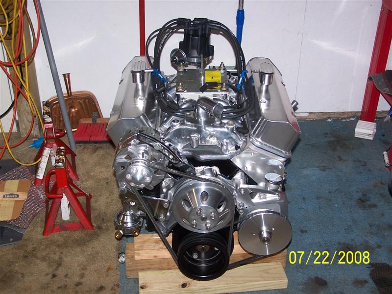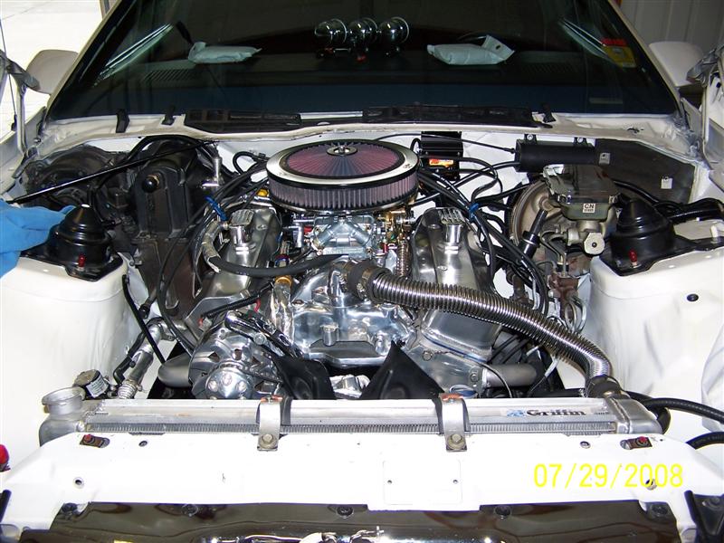 Well here's the update on the car and engine. I got the engine in and was ready to start it Wednesday, hit the key and I get nothing out of the starter. Turns out I have a wire in the wrong place, fix that and try again to start car. I couldn't the thing to fire on all 8 cylinders to save my life, spent the next three evenings after work trying to figure it out. Everything under the hood for iginition is brand new but it would not fire, turns out to a coil not compatible with the distributor, put a different coil on and she fires right up albeit shaking like a banshee. Now it looks like the balancer I bought for a 400 does not work, another bad buy, so tomorrow I put a stock 400 balancer on to see if that cures it. I have to say though, that bad boy sure sounded good and strong. I'll let you know what I find out. Here's a couple of pics.