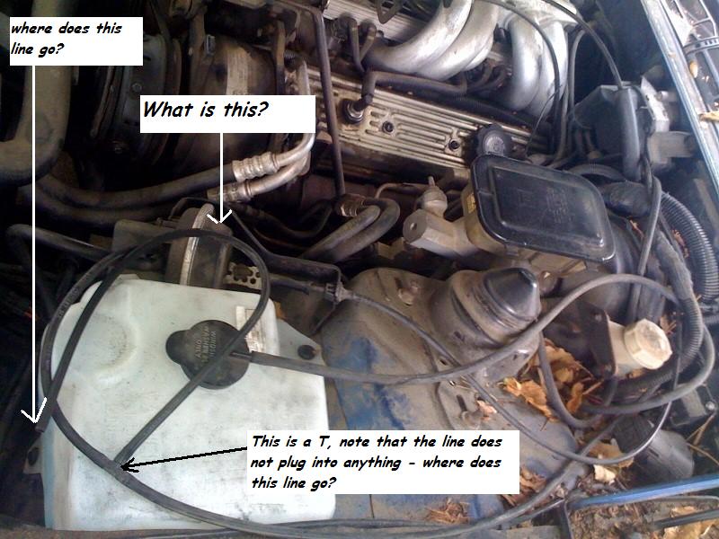 update: I think that line is supposed to go the "orb of power", the vacuum reserve cannister. I found it under the battery tray (driver's side on the firebird), and it appears there is nothing connected to it. I am going to remove it and see if I can get it hooked up.