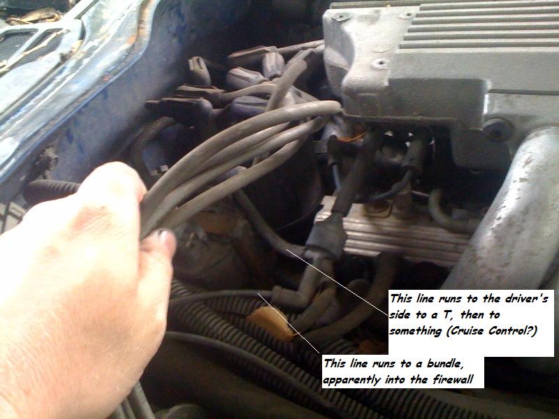 Check and see if the plastic ball underneath the driver side tray there, under the cruise control canister has the vacuum line attached... if not, that is the line for it.