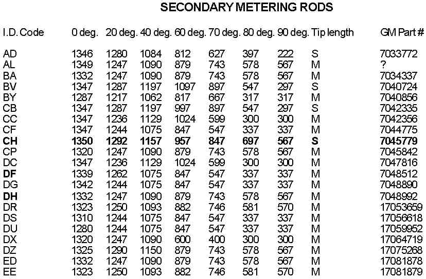 Here are the basics of rods and hangers. The thinner the tip of the rod, the richer it is (more fuel can flow around it.) The thin part at the tip is called the power tip. The longer it is, the faster you go under enrichment when you floor it. For drag racing purposes, and in general, a longer power tip will give better response and performance. Rods have identifying letter stamped on their sides. The letters are nearly meaningless though without a book on rod specifications. Instead, compare them by sight. If you do have access to specifications, look for thin tips and long power tips (also found by short tapered sections). A great all around set of rods IMHO are the CKs, which are marginally richer than stock L69 rod, but with a longer power tip.